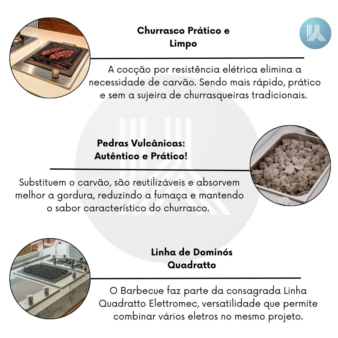 O Barbecue faz parte da consagrada Linha Quadratto Elettromec, composta por dominós a gás, vitrocerâmicos e outros modelos exclusivos. Essa versatilidade permite combinar eletros no mesmo projeto, garantindo maior funcionalidade, performance e estilo para qualquer espaço gourmet moderno.