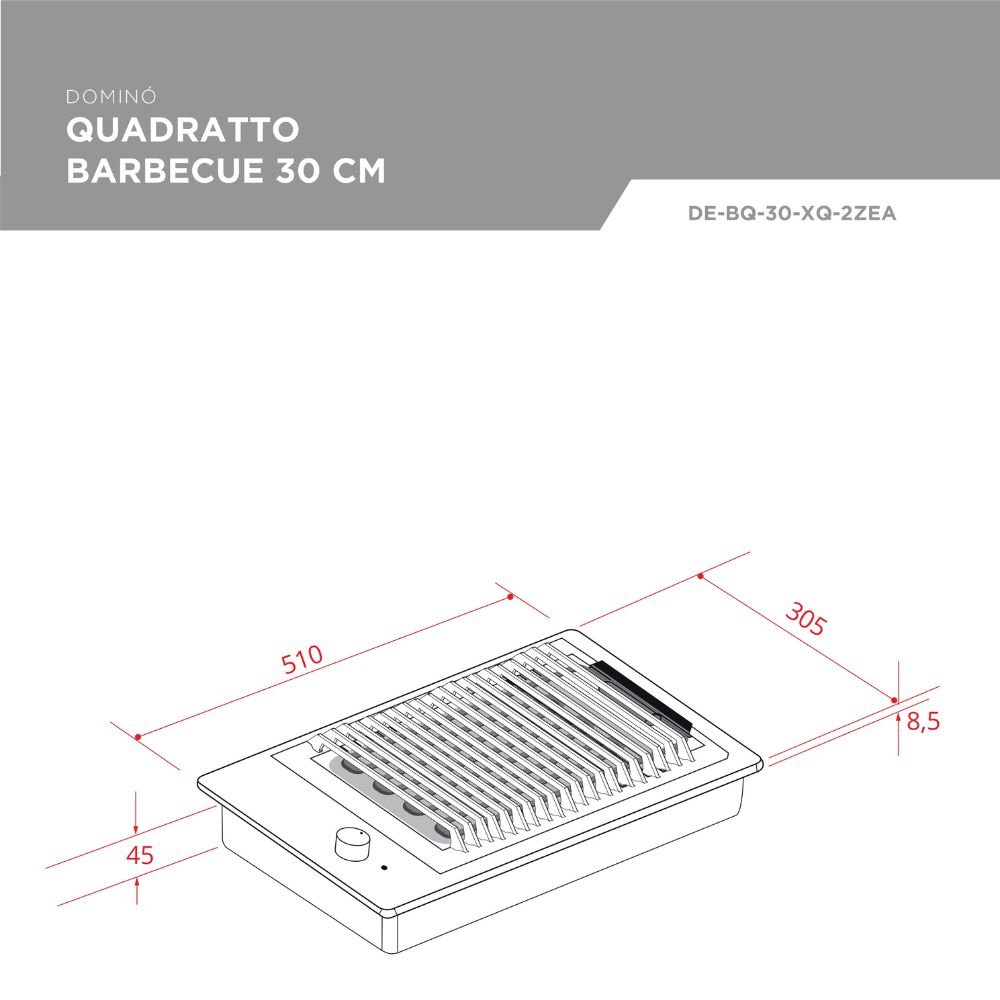 Com acabamento em aço inox e apenas 30 cm de largura, o Dominó Quadratto Barbecue se adapta facilmente a bancadas de diferentes tamanhos. Seu visual moderno harmoniza com outros produtos da linha Quadratto, permitindo composições elegantes em projetos de cozinhas e varandas gourmet.