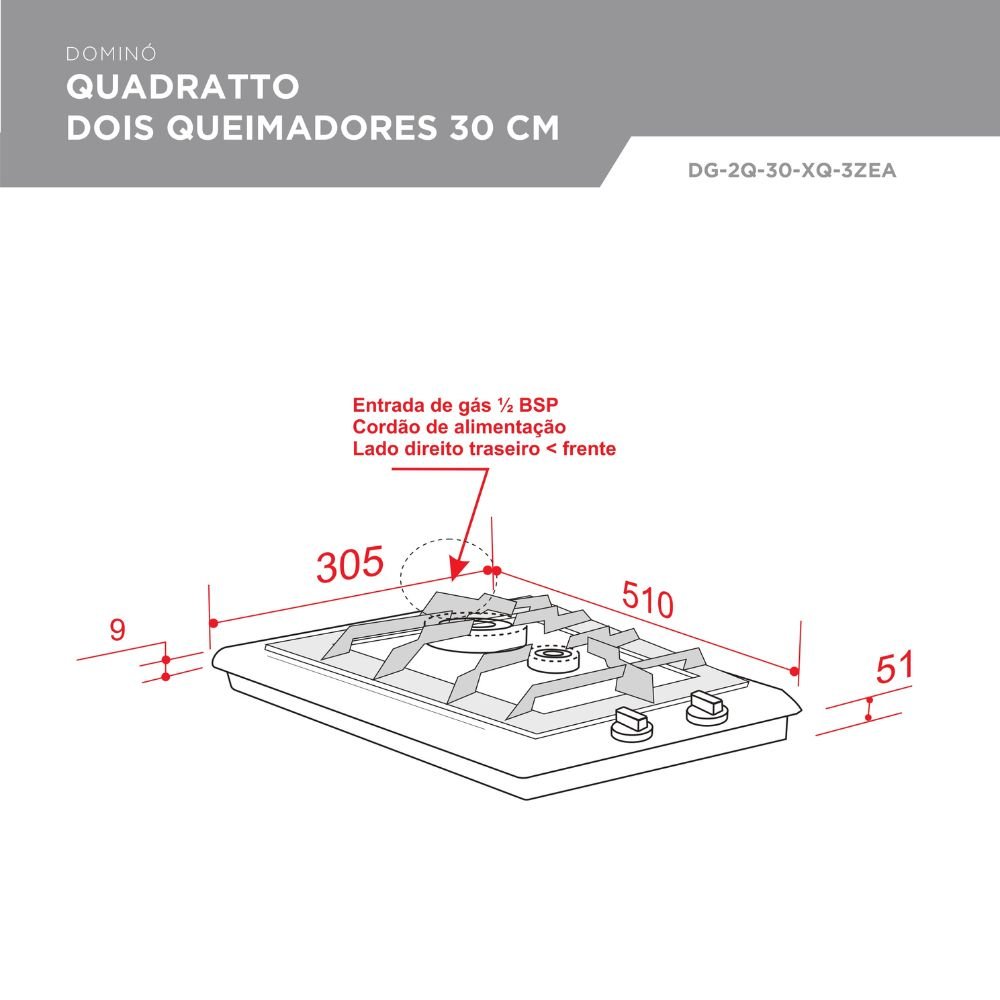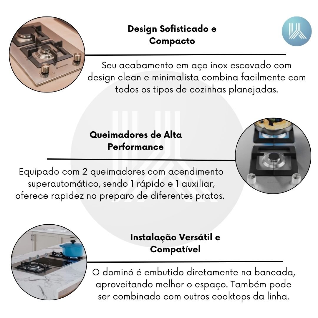 Com largura de 30 cm, o dominó é embutido diretamente na bancada, aproveitando melhor o espaço. Pertencente à família Quadratto, ele pode ser combinado com outros cooktops da linha, garantindo harmonia visual e funcionalidade. A instalação é simples, prática e garante liberdade na organização de cozinhas e áreas gourmet.