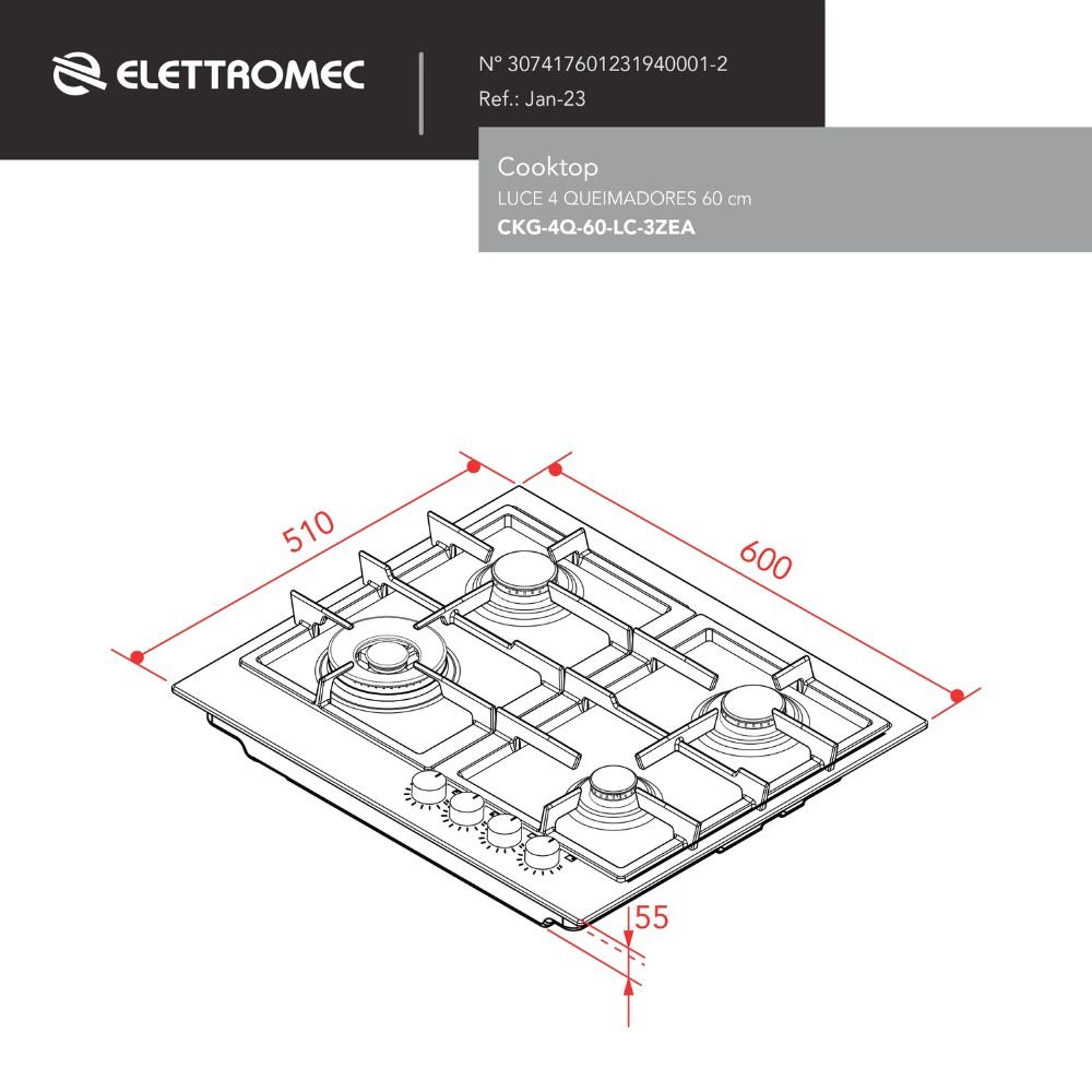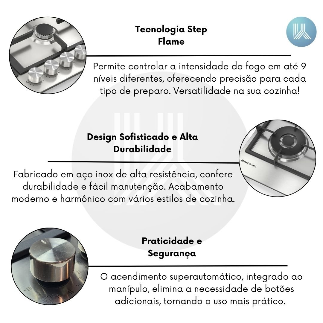 O Cooktop Luce 4 Queimadores 60 cm da Elettromec combina elegância, eficiência e segurança em um único equipamento. Com acabamento em aço inoxidável, trempes contínuas em ferro fundido e a inovadora tecnologia Step Flame, este modelo é ideal para quem busca praticidade sem abrir mão de precisão no preparo dos alimentos. Compacto e versátil, é perfeito para cozinhas modernas que exigem sofisticação e desempenho.