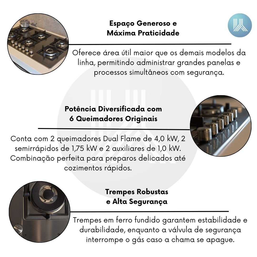 Conta com 2 queimadores Dual Flame de 4,0 kW, 2 semirrápidos de 1,75 kW e 2 auxiliares de 1,0 kW. Essa combinação garante controle preciso da chama e permite desde preparos delicados até cozimentos rápidos, adaptando-se às necessidades de cada receita com performance e economia de tempo.