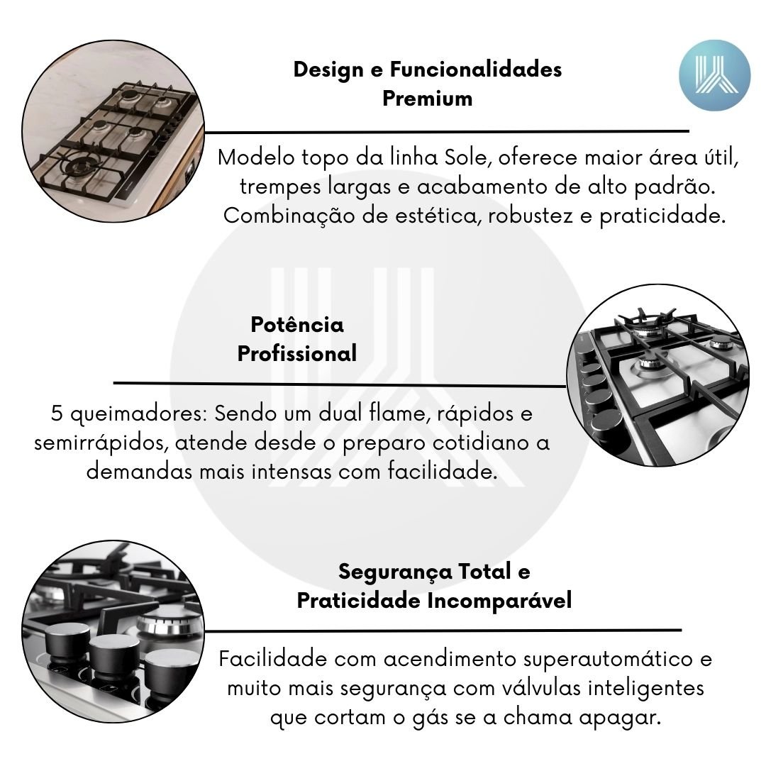 O Cooktop Sole 90 cm reúne design, potência e segurança para transformar sua cozinha em um ambiente gourmet com performance semiprofissional. Com acabamento em vidro preto e aço inoxidável, alia estética e facilidade de limpeza, sendo indicado para projetos que exigem presença e eficiência. Confira as especificações e garanta já o seu.