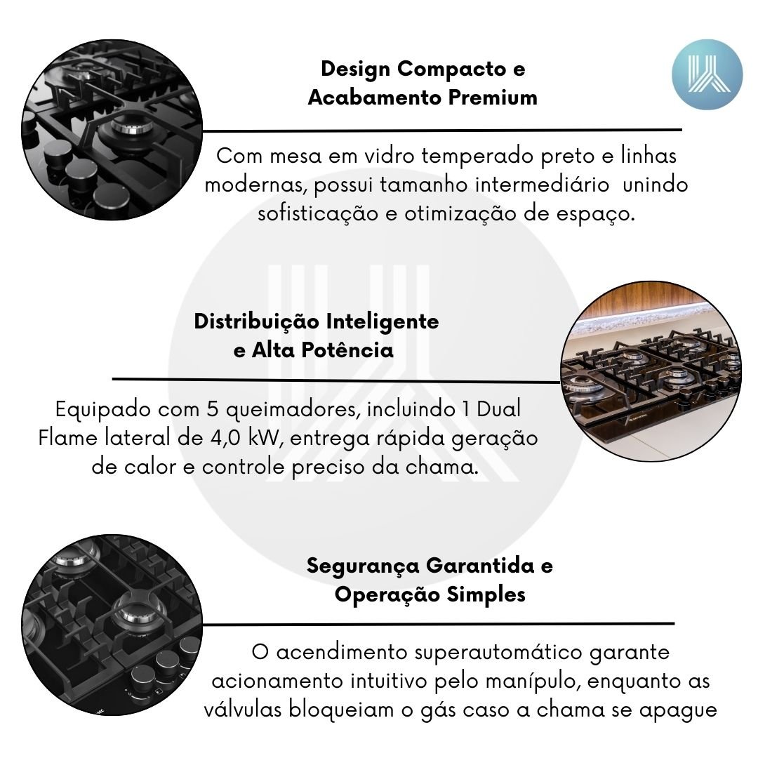 Equipado com 5 queimadores, incluindo 1 Dual Flame lateral de 4,0 kW, entrega rápida geração de calor e controle preciso da chama. A distribuição das bocas permite uso simultâneo de panelas de diferentes tamanhos e o conjunto de queimadores rápido, semirrápidos e auxiliar garante versatilidade para variadas receitas e tempos de preparo.