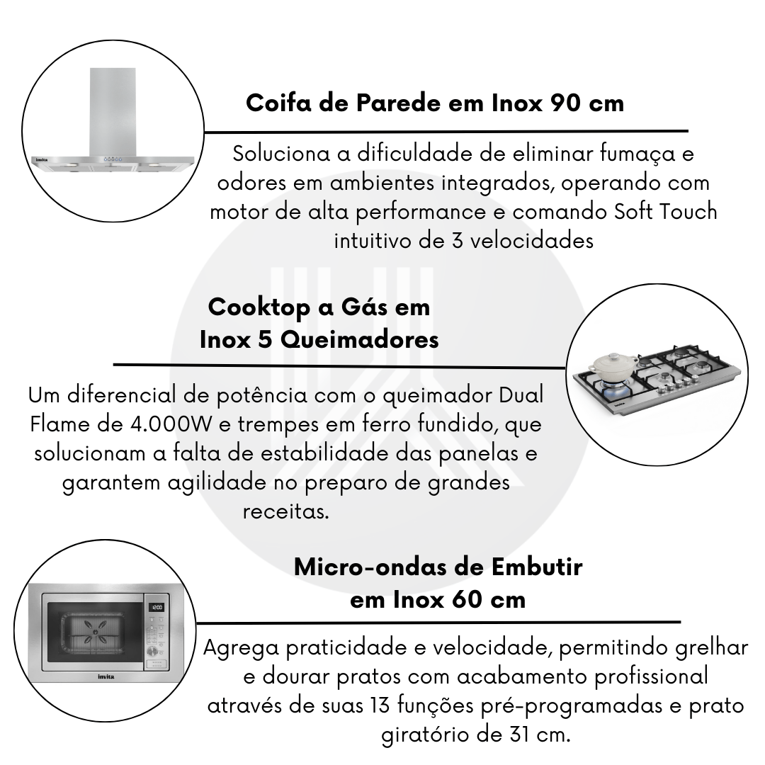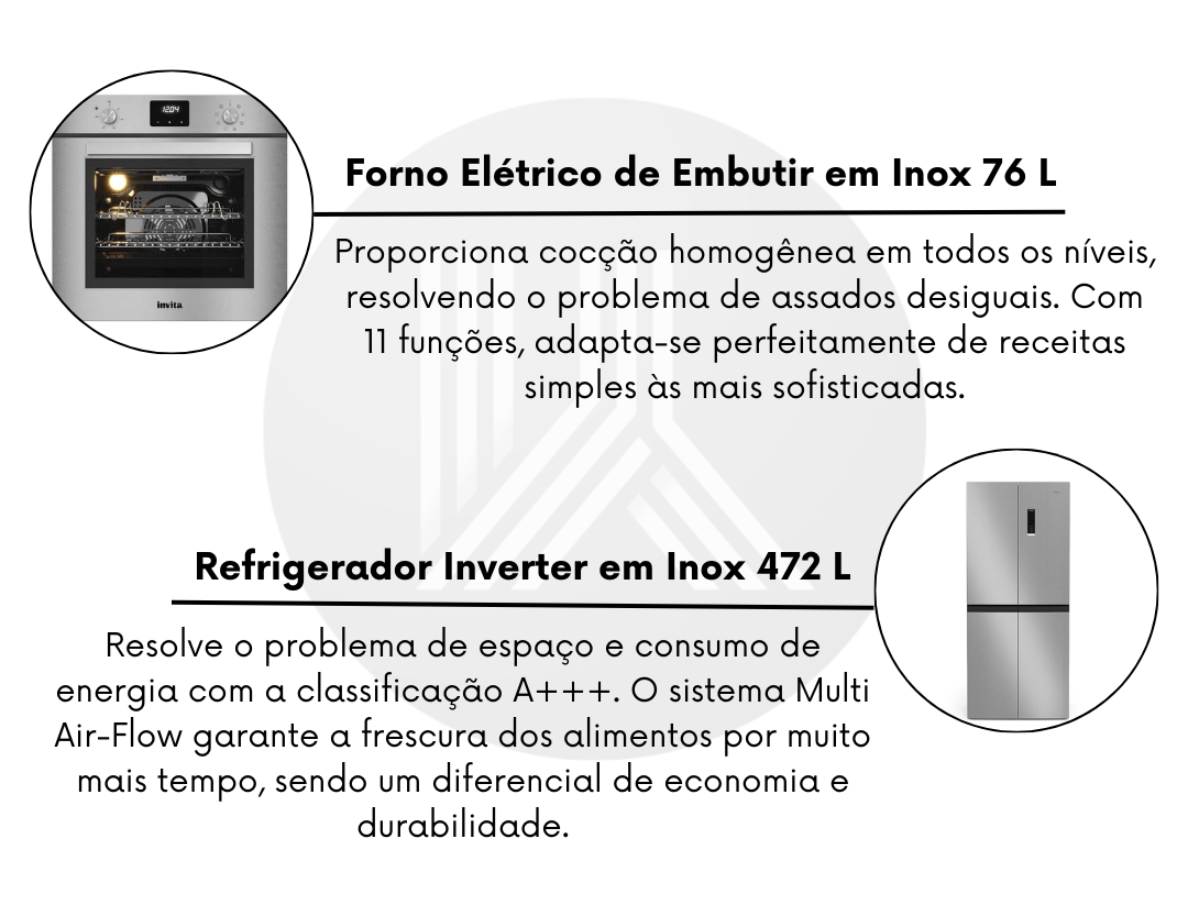 Refrigerador Invita Multidoor Inverter Titânio 472 Litros 220VCor: Inox Escovado Opção: 220VCooktop Invita à Gás em Inox Dual Flame 5 Queimadores Bivolt 90cmCor: Inox Escovado Opção: 5 Queimadores - 90cmCoifa de Parede Invita Inox - 90 cmCor: Inox Escovado Opção: 220VForno Elétrico Invita em Inox com Convecção 76L 220vCor: Inox Escovado Opção: 220VMicro-ondas de Embutir Invita em Inox Multifuncionalidade Gourmet 60cmCor: Inox Escovado Opção: 220V