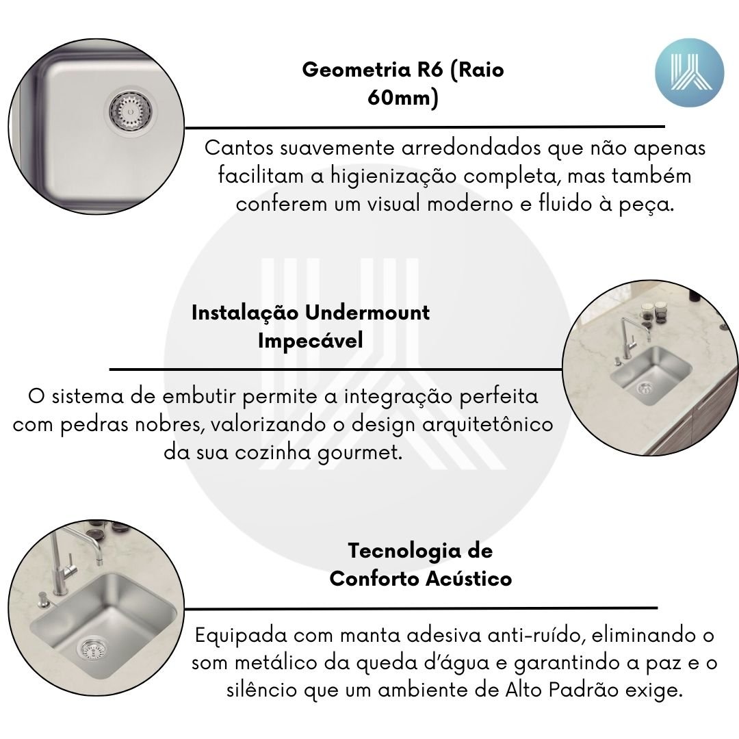 O sistema de embutir permite a integração perfeita com pedras nobres, valorizando o design arquitetônico da sua cozinha gourmet.