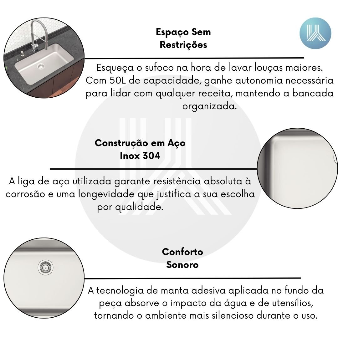 A tecnologia de manta adesiva aplicada no fundo da peça absorve o impacto da água e de utensílios, tornando o ambiente mais silencioso durante o uso intenso.
