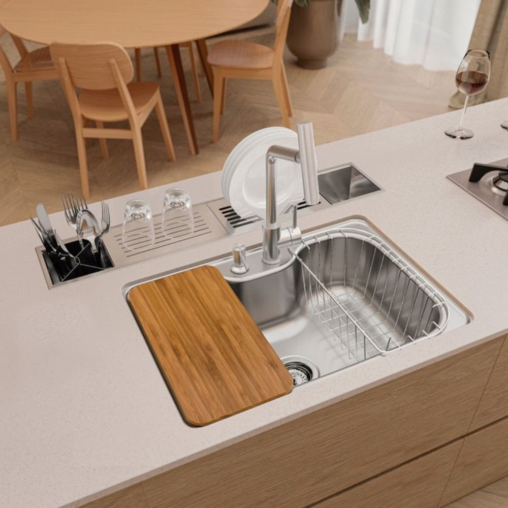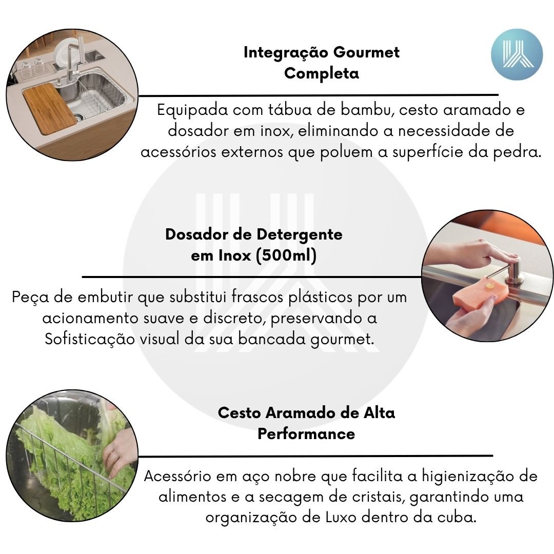 Equipada com tábua de bambu bactericida, cesto aramado e dosador de detergente em inox, eliminando a necessidade de acessórios externos que poluem a superfície da pedra.