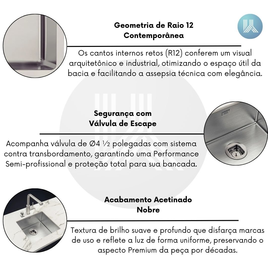 Acompanha válvula de Ø4 ½ polegadas com sistema contra transbordamento, garantindo uma Performance Semi-profissional e proteção total para sua bancada.