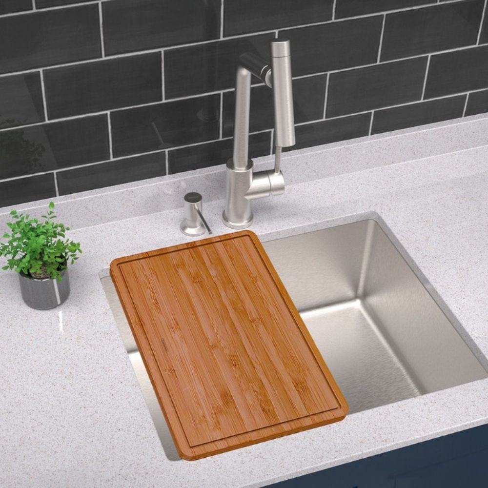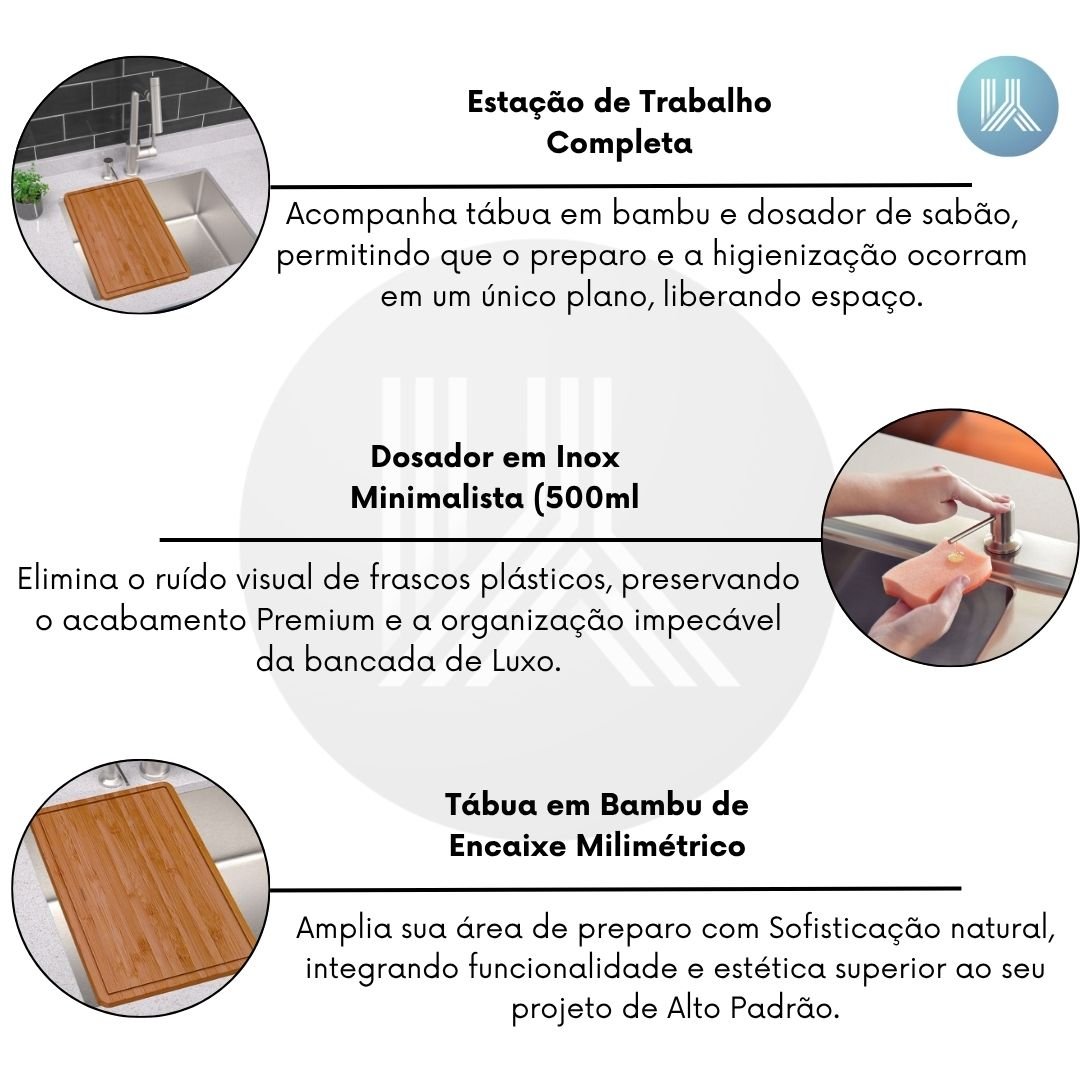 Acompanha tábua em bambu e dosador de sabão de 500ml, permitindo que o preparo e a higienização ocorram em um único plano, liberando espaço precioso sobre o granito ou quartzo.