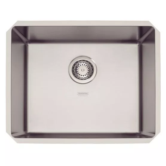 Os cantos internos retos conferem um visual industrial e contemporâneo, facilitando a higienização técnica e maximizando o aproveitamento do fundo da cuba.