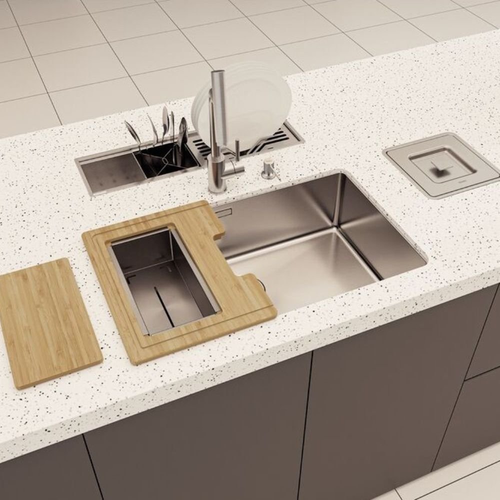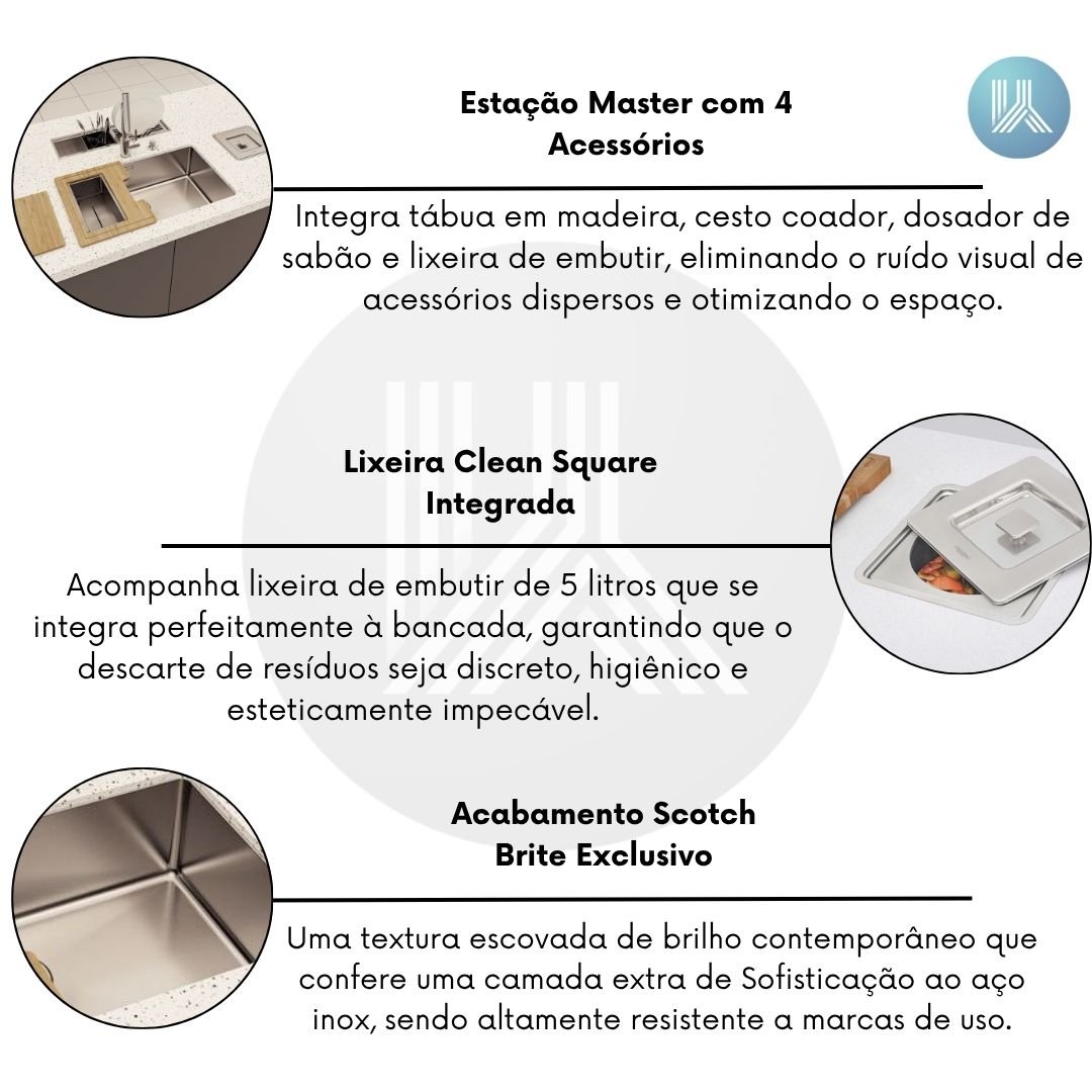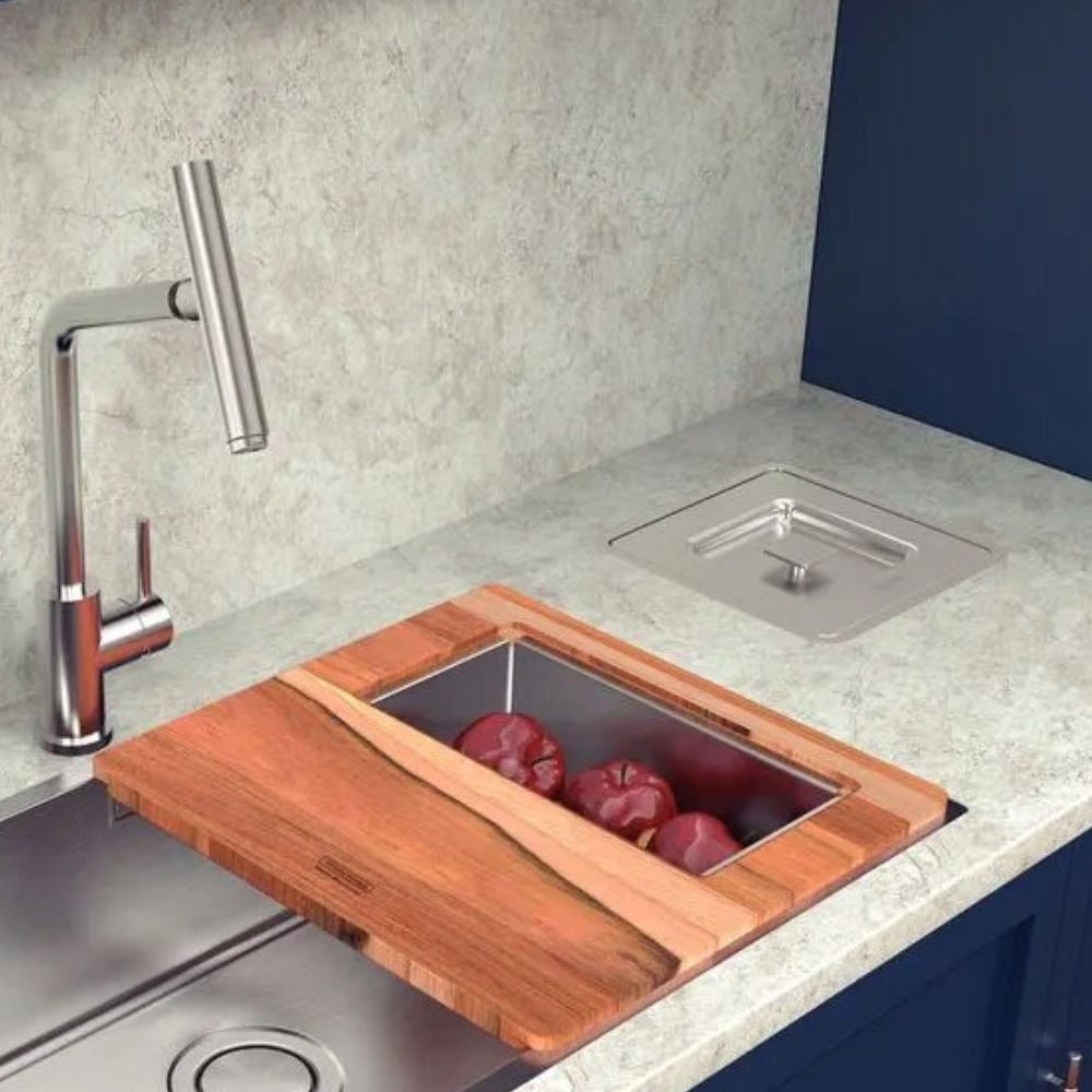 Integra tábua em madeira nobre, cesto coador, dosador de sabão e lixeira quadrada de embutir, eliminando o ruído visual de acessórios dispersos e otimizando o seu Investimento em espaço.