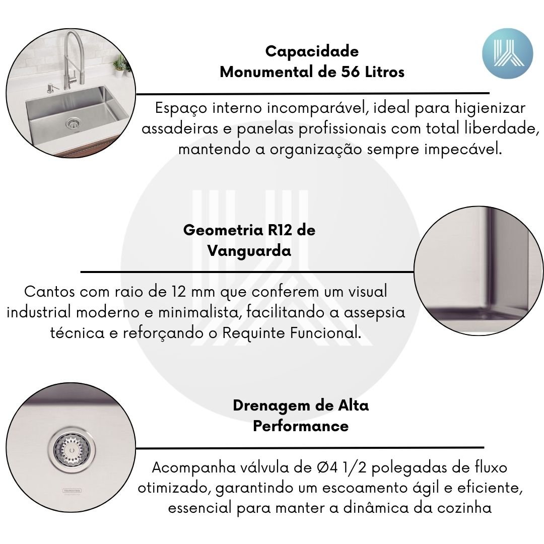 Projetos de cozinhas amplas exigem uma zona molhada que acompanhe a escala e a importância do ambiente. Cubas de dimensões reduzidas em bancadas generosas geram uma desproporção estética incômoda e limitam a funcionalidade durante o preparo de grandes recepções. A Cuba Tramontina Quadrum 70 U resolve esse dilema com maestria. Com sua bacia generosa de 56 litros e o rigor das linhas retas, ela entrega a amplitude necessária para o manejo de utensílios de grande porte, consolidando-se como o elemento central para quem exige Alto Padrão, silêncio e praticidade absoluta.
