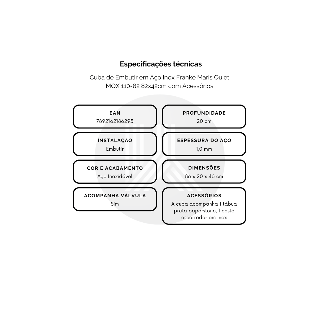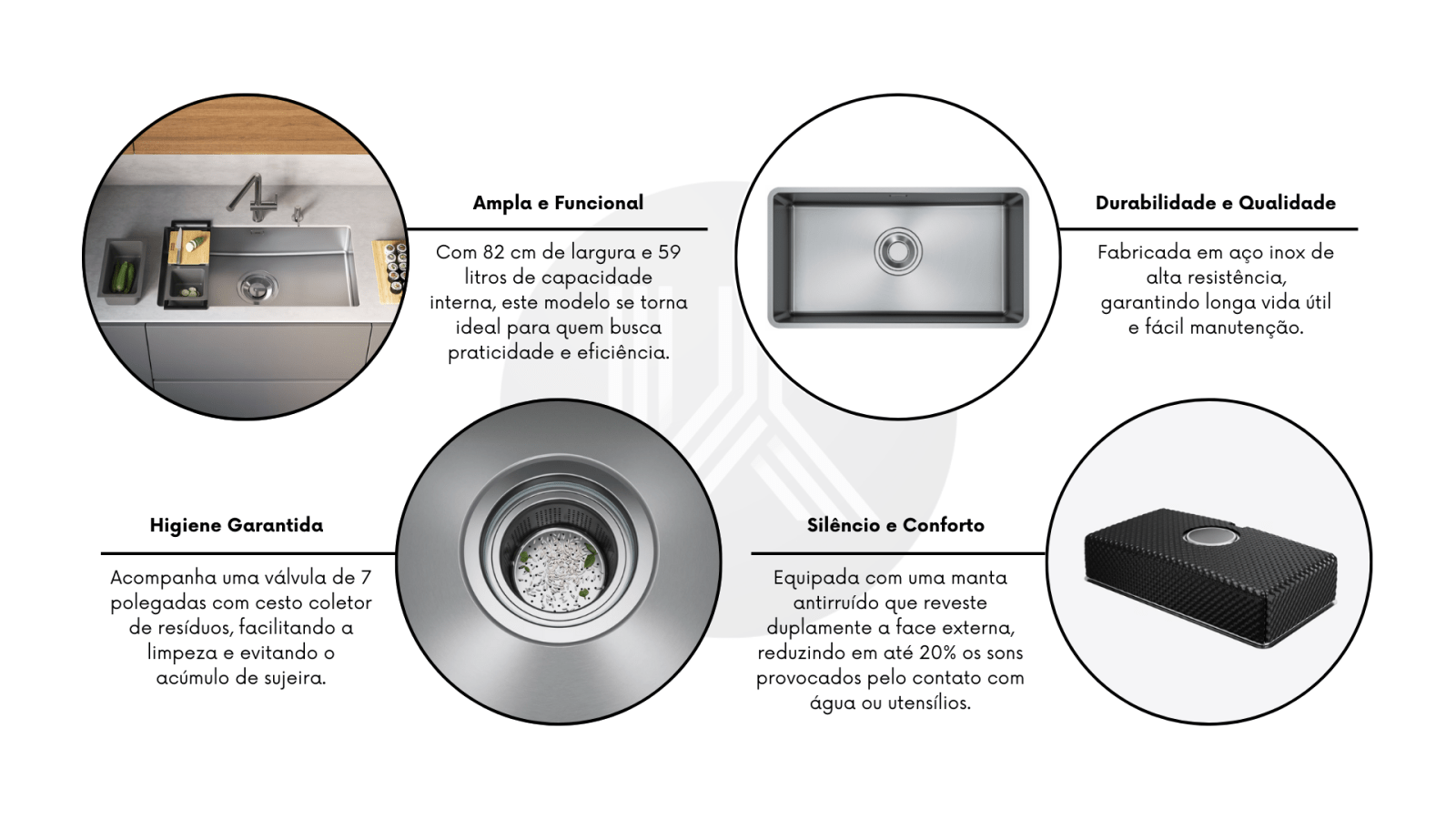 - A cuba é revestida com uma manta antirruído dupla, que reduz em até 20% os barulhos causados por água ou objetos em contato com o inox.