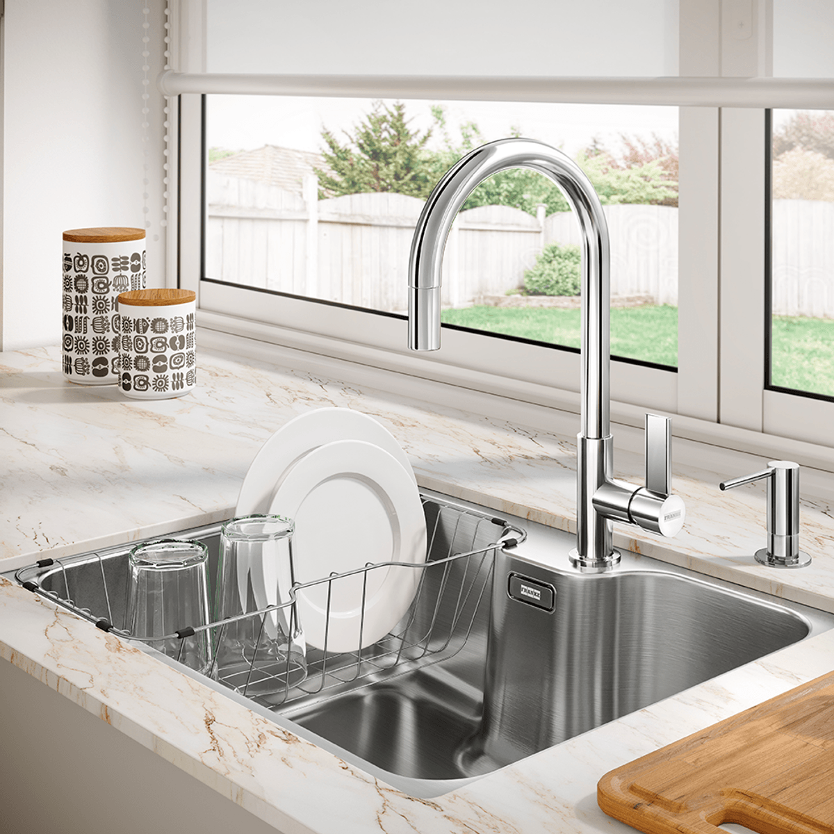 - Acompanha acessórios: Cesto escorredor de plástico, dosador de sabão cromado e tábua de preparação em madeira