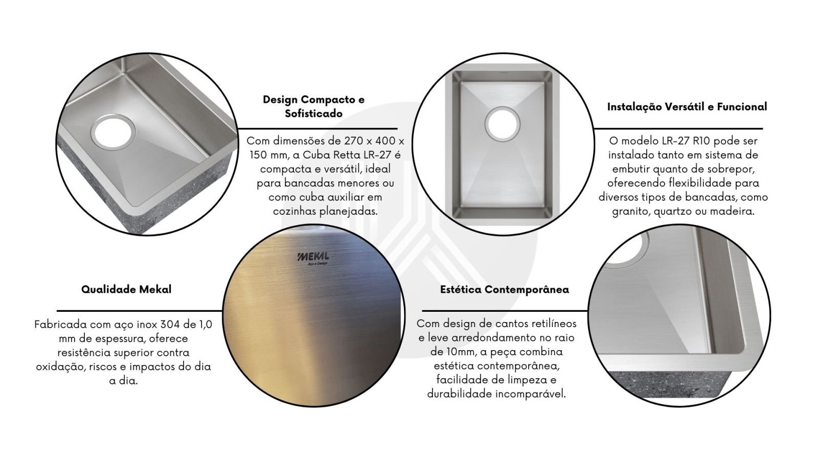 A Cuba Retta LR-27 R10 da Mekal é a escolha ideal para quem busca modernidade, praticidade e elegância em um único produto. Produzida em aço inox 304 de alta resistência e com acabamento escovado premium, esta cuba compacta é perfeita para cozinhas planejadas, áreas gourmet e ambientes que valorizam sofisticação aliada à funcionalidade. Com design de cantos retilíneos e leve arredondamento no raio de 10mm, a peça combina estética contemporânea, facilidade de limpeza e durabilidade incomparável.