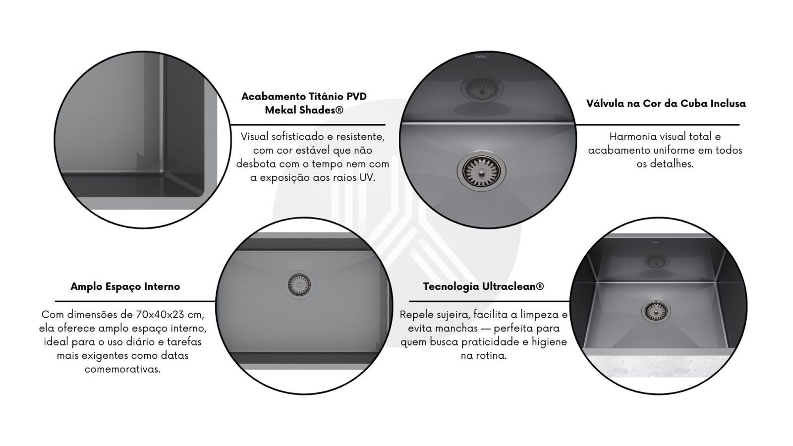 Sistema antirruído e conforto no uso: Pensada para oferecer praticidade e silêncio, a Cuba LR-70 Mekal Shades Titânio com Ultraclean® conta com manta antirruído aplicada nos quatro cantos e no fundo, além de uma pintura externa especial. Esse sistema reduz significativamente o som do impacto da água e dos utensílios, tornando a rotina na cozinha muito mais confortável.