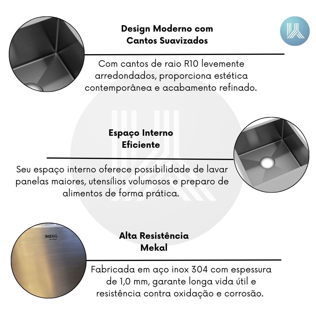 A instalação pode ser feita em embutir ou sobrepor, oferecendo flexibilidade para diferentes tipos de projeto. O furo de válvula de 4½” é compatível com trituradores de alimentos, agregando praticidade e tecnologia ao ambiente. Outro diferencial é a fabricação precisa da Mekal, que entrega uma cuba sólida, com acabamento premium e pensada para manter a estética elegante em qualquer proposta de cozinha.