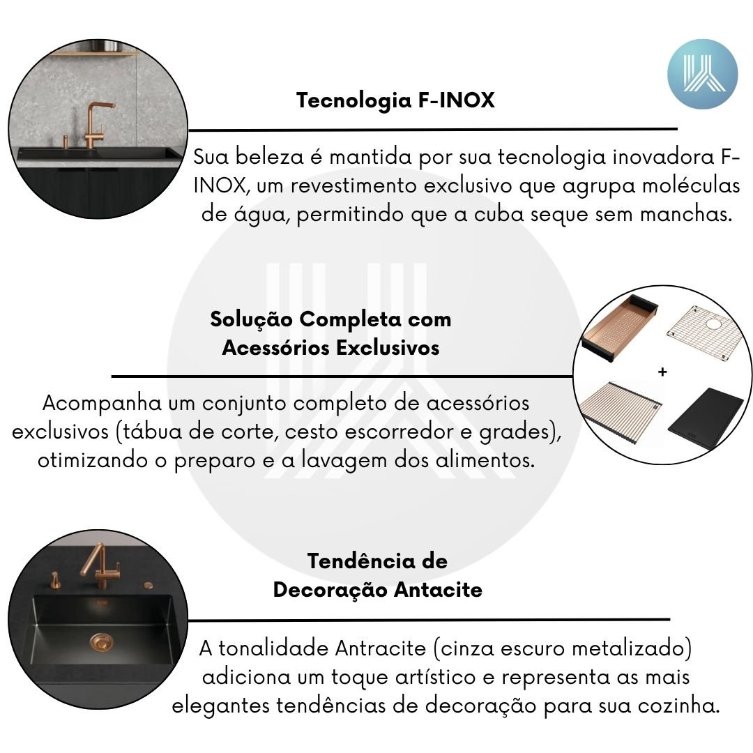 A beleza da cuba é mantida por sua fórmula inovadora F-INOX, um revestimento exclusivo Franke que agrupa moléculas de água, permitindo que a cuba seque sem manchas. Além do revestimento colorido PVD, o F-INOX repele água e óleo, sendo altamente resistente a arranhões e ao choque térmico de altas temperaturas, garantindo uma beleza real e duradoura.