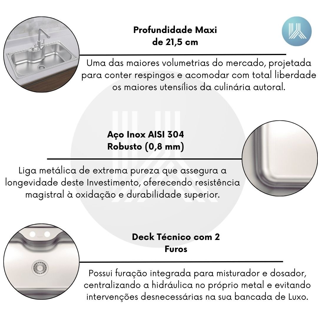 Possui furação integrada para misturador e dosador, centralizando a hidráulica no próprio metal e evitando intervenções desnecessárias na sua bancada de Luxo.