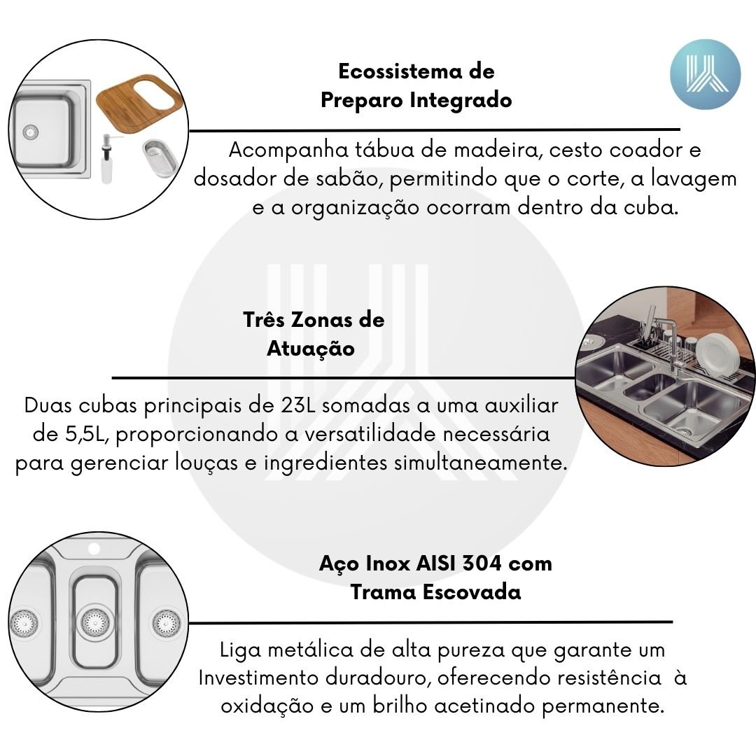 Projetos de Alto Padrão exigem que a funcionalidade seja tão impecável quanto a estética. O grande desafio de cozinhas amplas é a dispersão de utensílios, tábuas que deslizam na pedra, dosadores que ocupam espaço e cestos improvisados que quebram a harmonia visual. A Cuba Tramontina Marea Deep Tripla com Acessórios é a Solução Definitiva para quem busca centralizar toda a logística de preparo. Ao integrar tábua de madeira nobre, cesto coador e dosador de sabão em um vão de um metro, este conjunto entrega uma Performance Semi-profissional que mantém sua bancada limpa e seu foco no prazer de cozinhar.