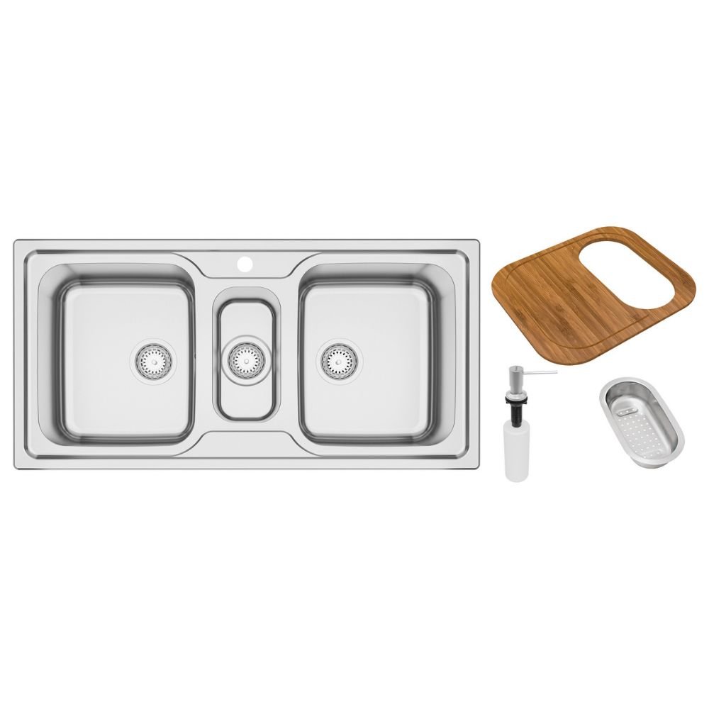 Acompanha tábua de madeira, cesto coador e dosador de sabão, permitindo que o corte, a lavagem e a organização ocorram dentro da cuba, preservando a pedra da sua bancada de Luxo.