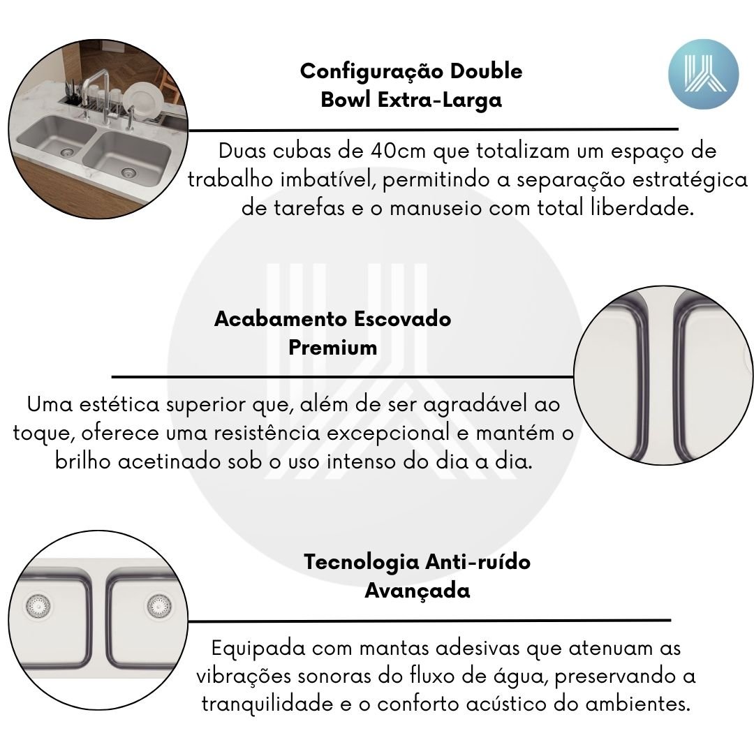 Duas bacias de 40 cm que totalizam um espaço de trabalho imbatível, permitindo a separação estratégica de tarefas e o manuseio de assadeiras e panelas de grande porte com total liberdade.