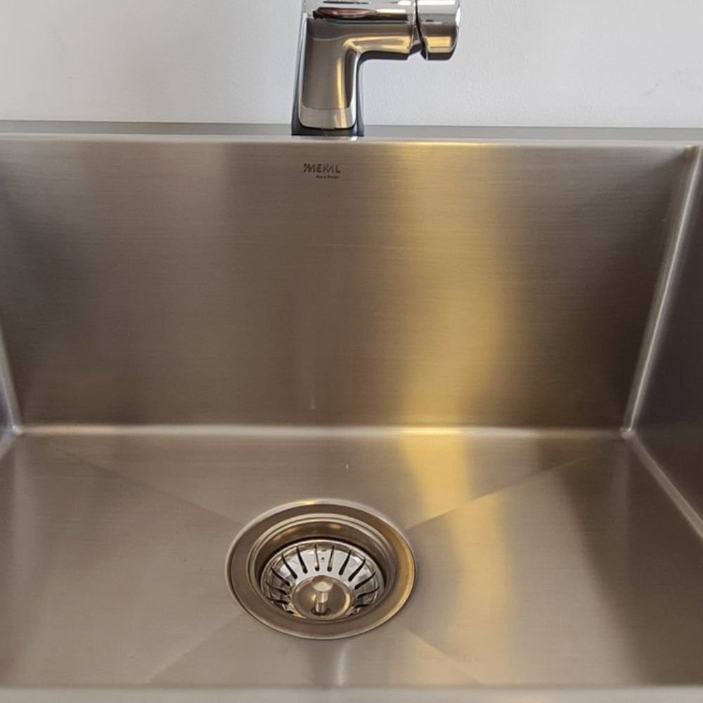 Com raio de 10 mm, a cuba apresenta cantos suaves em linhas retas, criando um visual contemporâneo e uniforme. Esse acabamento diferenciado elimina marcas de soldagem e reforça a sensação de elegância no ambiente. Além disso, o acabamento escovado hairline confere um brilho sutil, resistente ao uso diário, tornando a peça um verdadeiro destaque em sua cozinha.