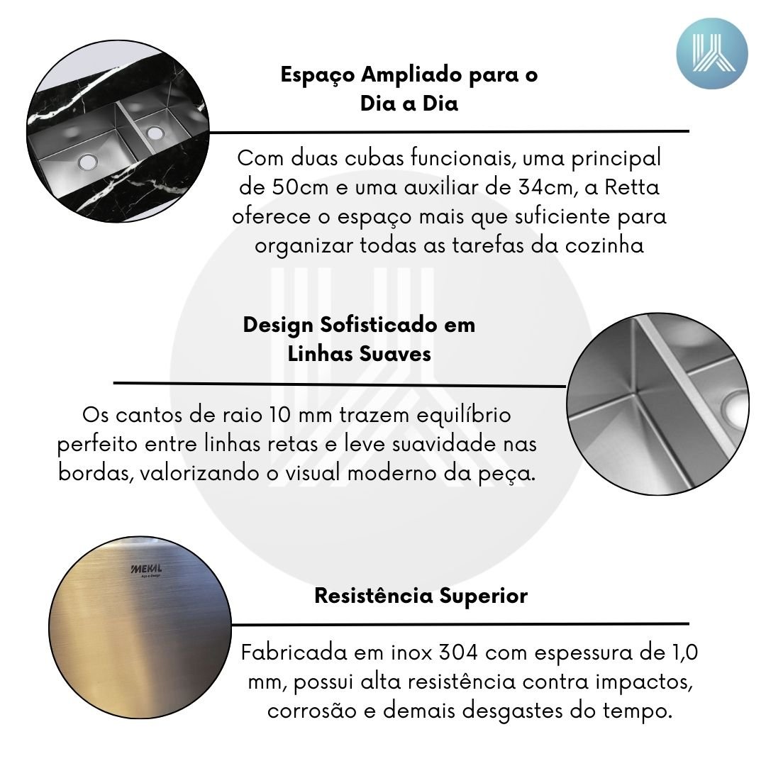 A linha Retta da Mekal foi desenvolvida para unir design sofisticado e máxima funcionalidade em cozinhas modernas. A Cuba LR-50/34 R10 se destaca por sua versatilidade, acabamento escovado impecável e dimensões generosas, sendo a escolha perfeita para quem busca praticidade sem abrir mão da elegância. Produzida em aço inox 304 de alta durabilidade, essa cuba dupla é ideal para famílias que valorizam organização e eficiência no dia a dia.