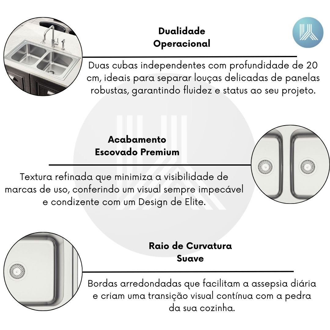 Duas cubas independentes com profundidade de 20 cm, ideais para separar louças delicadas de panelas robustas, garantindo fluidez e status ao seu projeto.