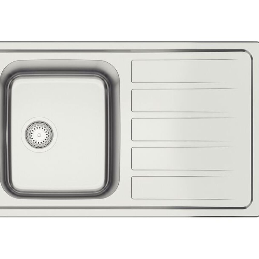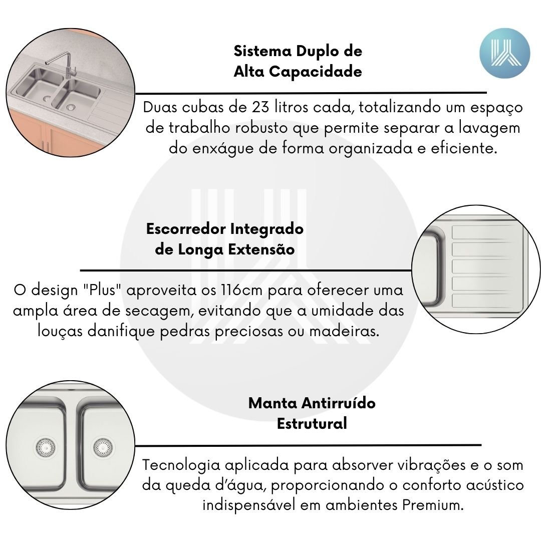 O design "Plus" aproveita os 116 cm para oferecer uma área de secagem em aço inox, evitando que a umidade das louças danifique pedras preciosas ou madeiras de Alto Padrão.