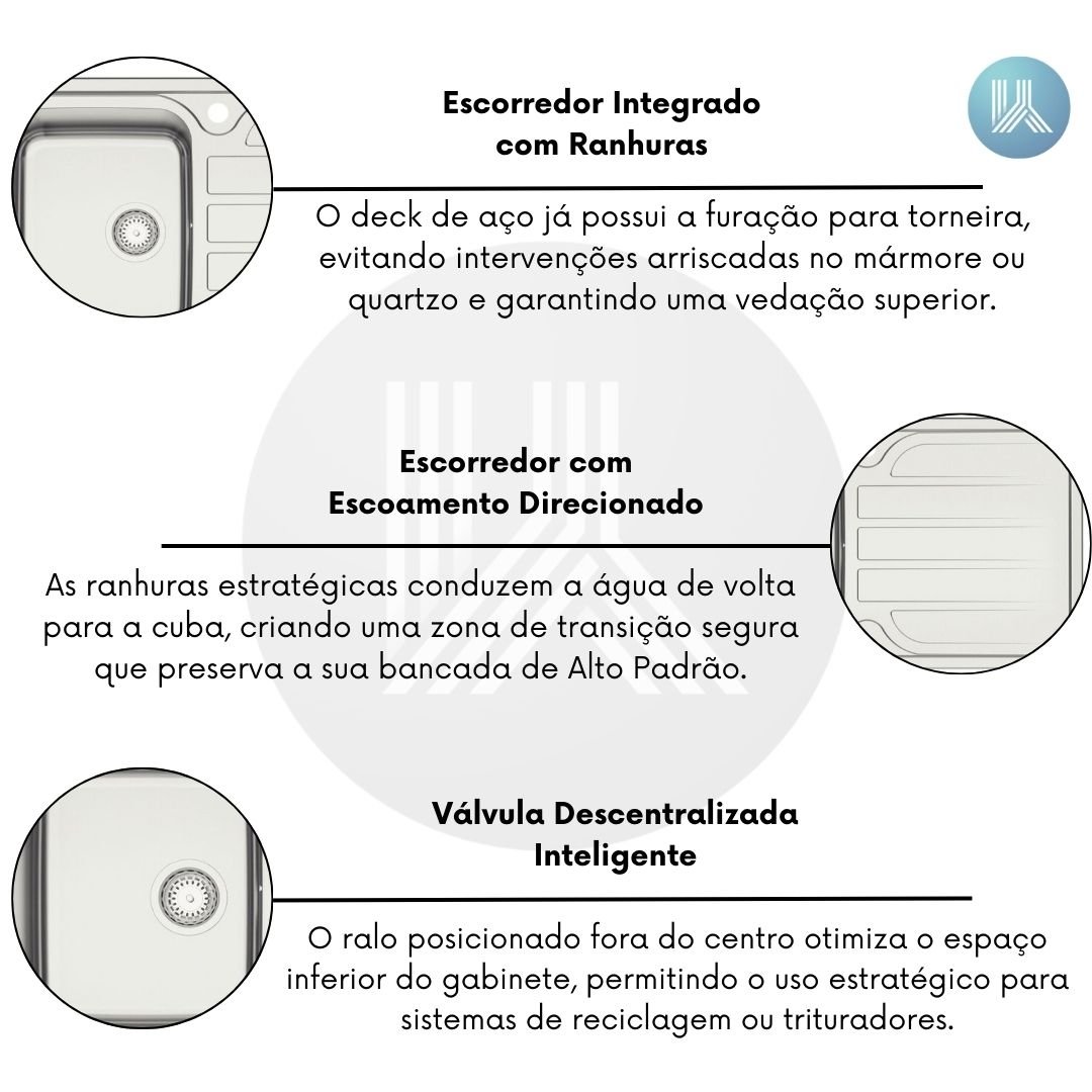 O deck de aço já possui a furação para torneira, evitando intervenções arriscadas no mármore ou quartzo e garantindo uma vedação superior e um acabamento de Design de Elite.