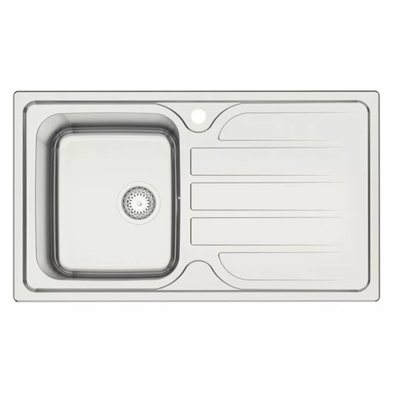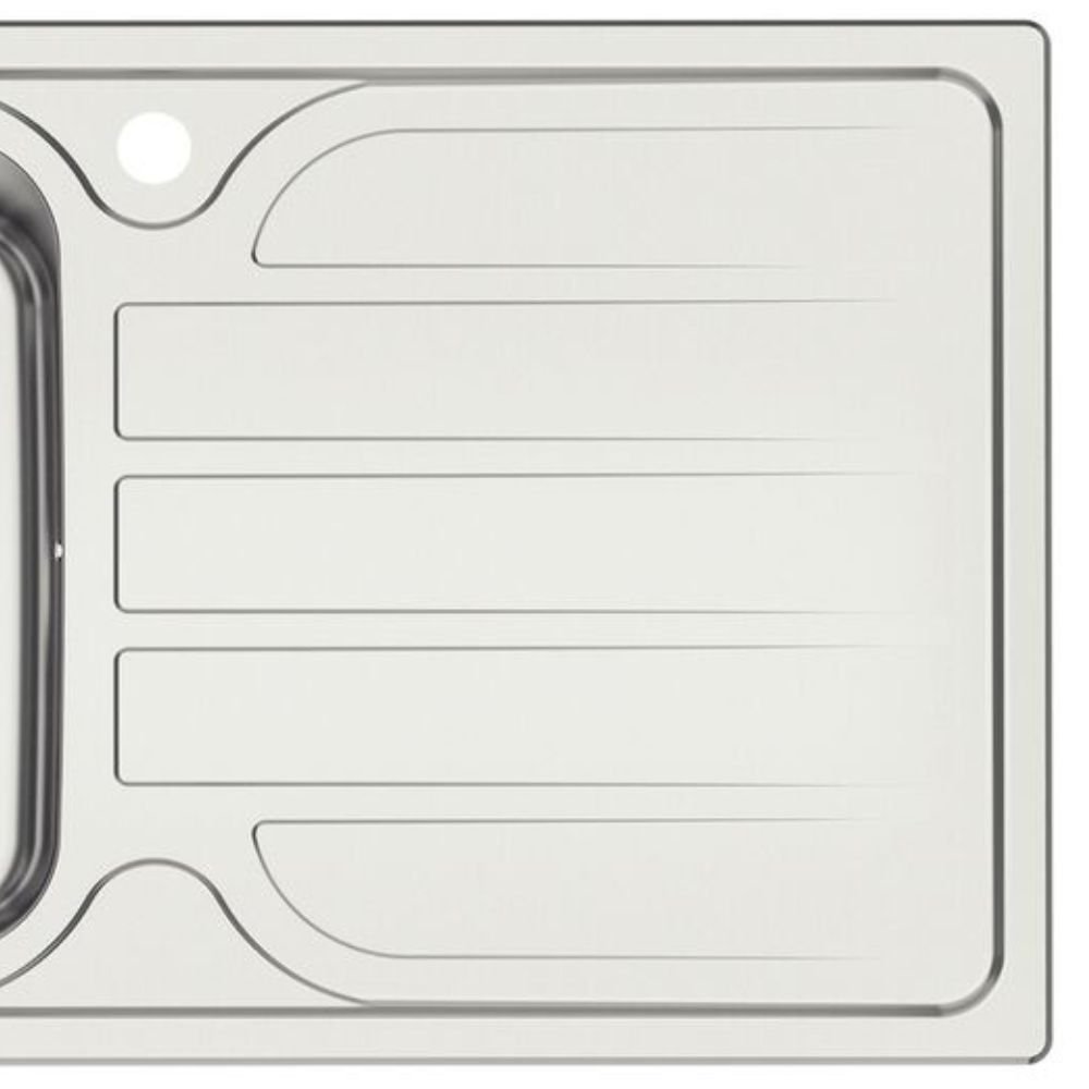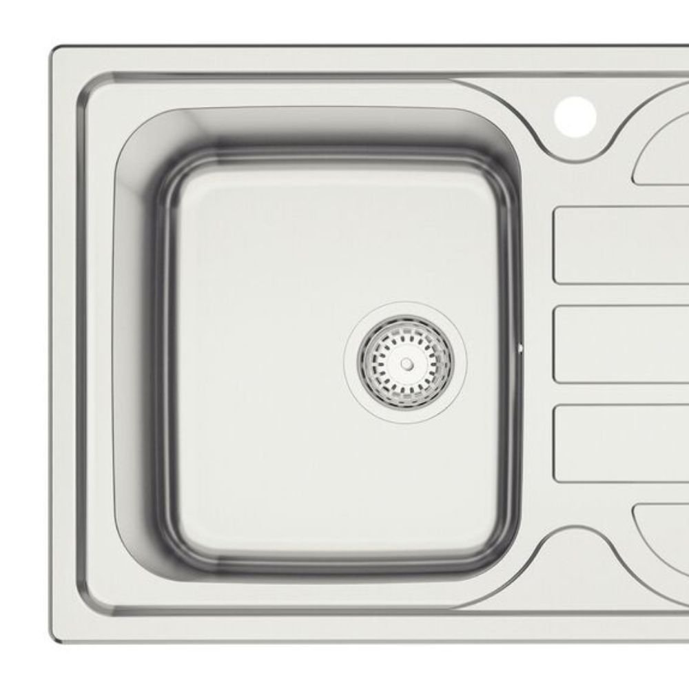 O ralo posicionado fora do centro otimiza o espaço inferior do gabinete, permitindo o uso estratégico para sistemas de reciclagem ou trituradores de alto desempenho.