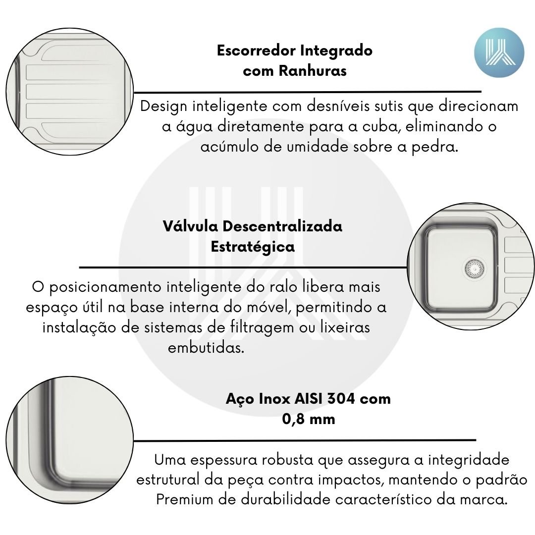 Design inteligente com desníveis sutis que direcionam a água diretamente para a cuba, eliminando o acúmulo de umidade sobre a pedra e elevando o status de organização do seu Investimento.