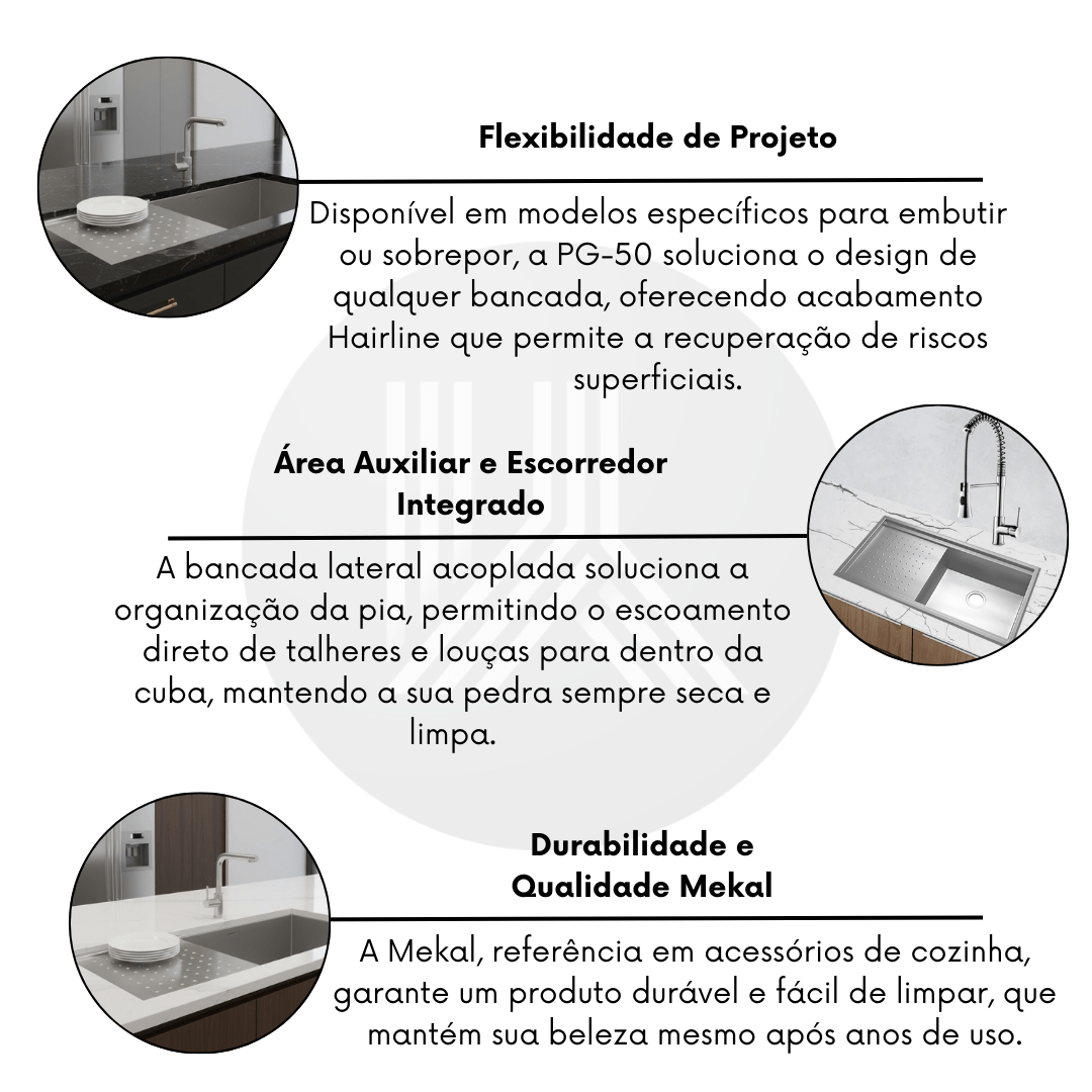 Flexibilidade de Projeto: Disponível em modelos específicos para embutir ou sobrepor, a PG-50 soluciona o design de qualquer bancada, oferecendo acabamento Hairline que permite a recuperação de riscos superficiais.