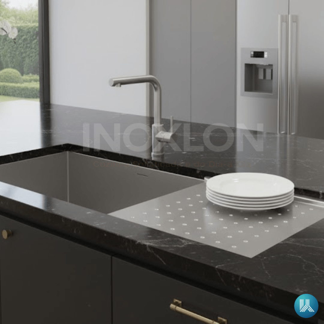 Área Auxiliar e Escorredor Integrado: A bancada lateral acoplada soluciona a organização da pia, permitindo o escoamento direto de talheres e louças para dentro da cuba, mantendo a sua pedra sempre seca e limpa.