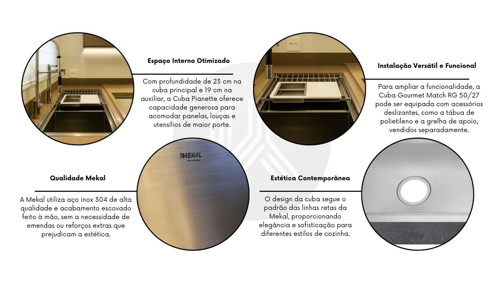 A Mekal utiliza aço inox 304 de alta qualidade e acabamento escovado feito à mão, sem a necessidade de emendas ou reforços extras que prejudicam a estética. Esse processo artesanal resulta em um produto silencioso, livre de vibrações indesejadas, além de extremamente resistente à corrosão e ao desgaste do uso contínuo, o que reafirma o compromisso da marca com a excelência.