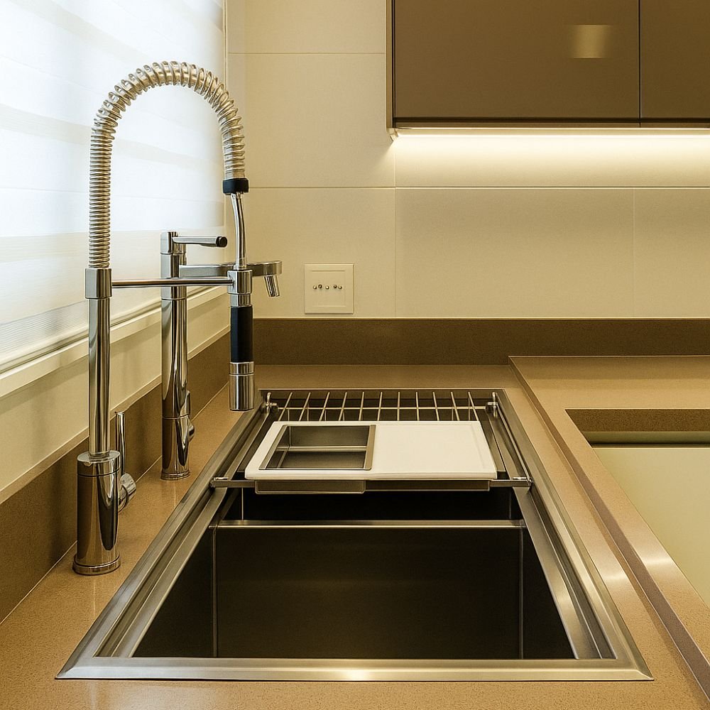 Para ampliar a funcionalidade, a Cuba Gourmet Match RG 50/27 pode ser equipada com acessórios deslizantes, como a tábua de polietileno e a grelha de apoio, vendidos separadamente. Esses itens tornam a rotina ainda mais prática, permitindo preparar alimentos, escorrer utensílios e otimizar a bancada sem perder espaço, transformando sua cozinha em um ambiente versátil e moderno.