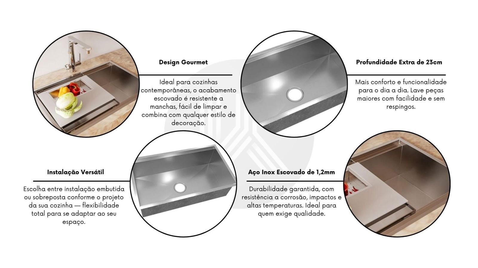 Ideal para Cozinhas Gourmet e Compactas: Mesmo com tamanho médio, oferece excelente capacidade e profundidade, otimizando o uso da bancada.