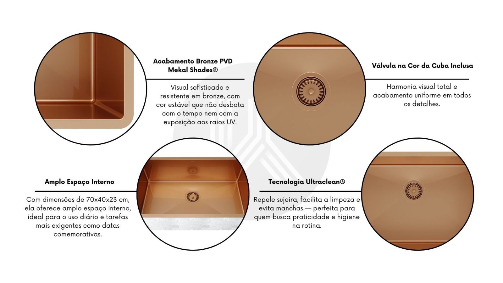 A Cuba LR-70 Mekal Shades Bronze com Ultraclean® é mais do que um item funcional – é um elemento de destaque no projeto da sua cozinha. Garanta um produto de alta performance, com tecnologia de ponta, estética refinada e benefícios que fazem a diferença no seu dia a dia.