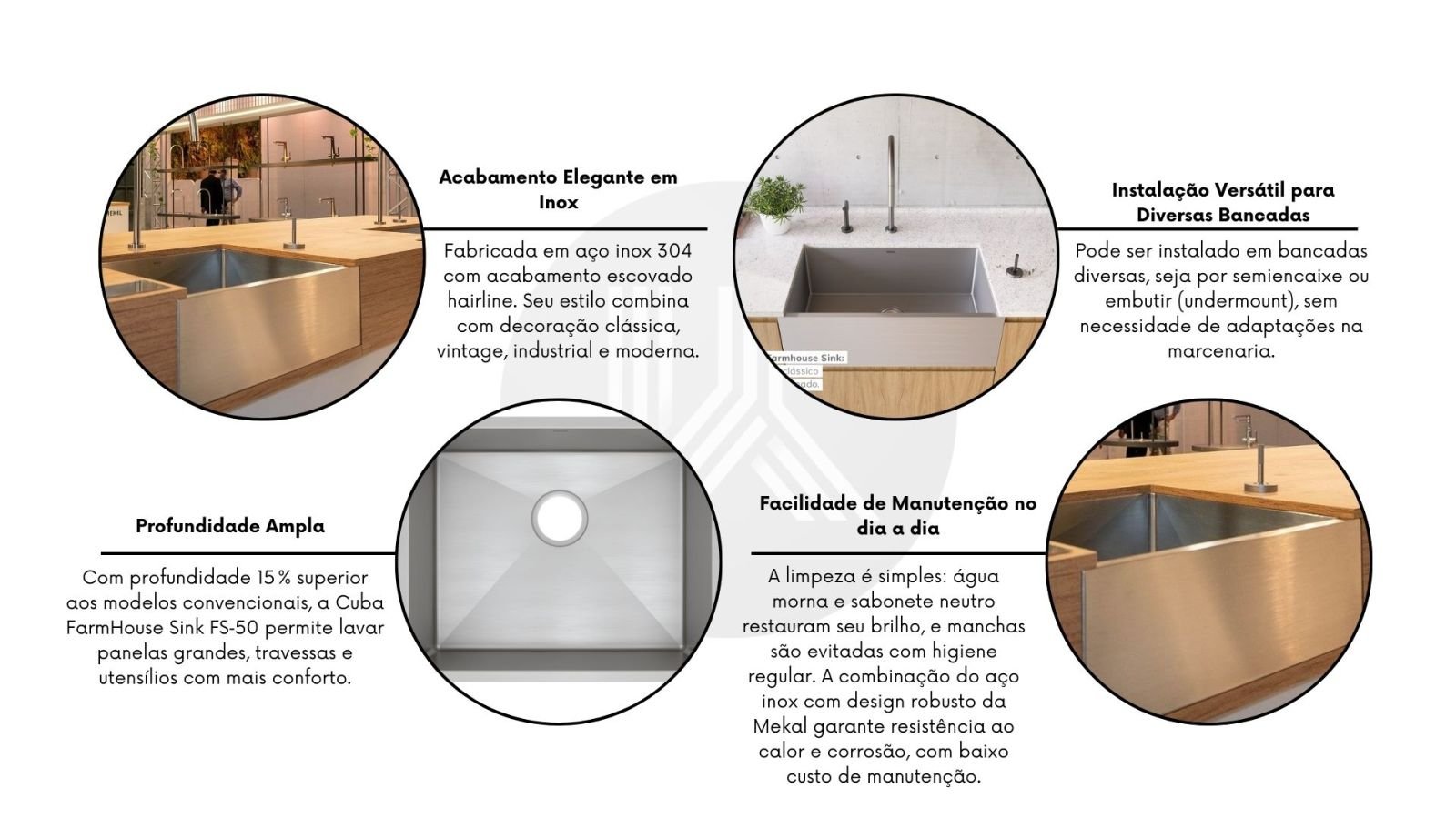 A Cuba Mekal FarmHouse Sink FS‑50 é ideal para quem valoriza design autêntico, espaço de uso e qualidade superior. Com profundidade, acabamento primoroso, instalação flexível e manutenção fácil, é a escolha certa para transformar sua cozinha em um ambiente sofisticado, funcional e duradouro.