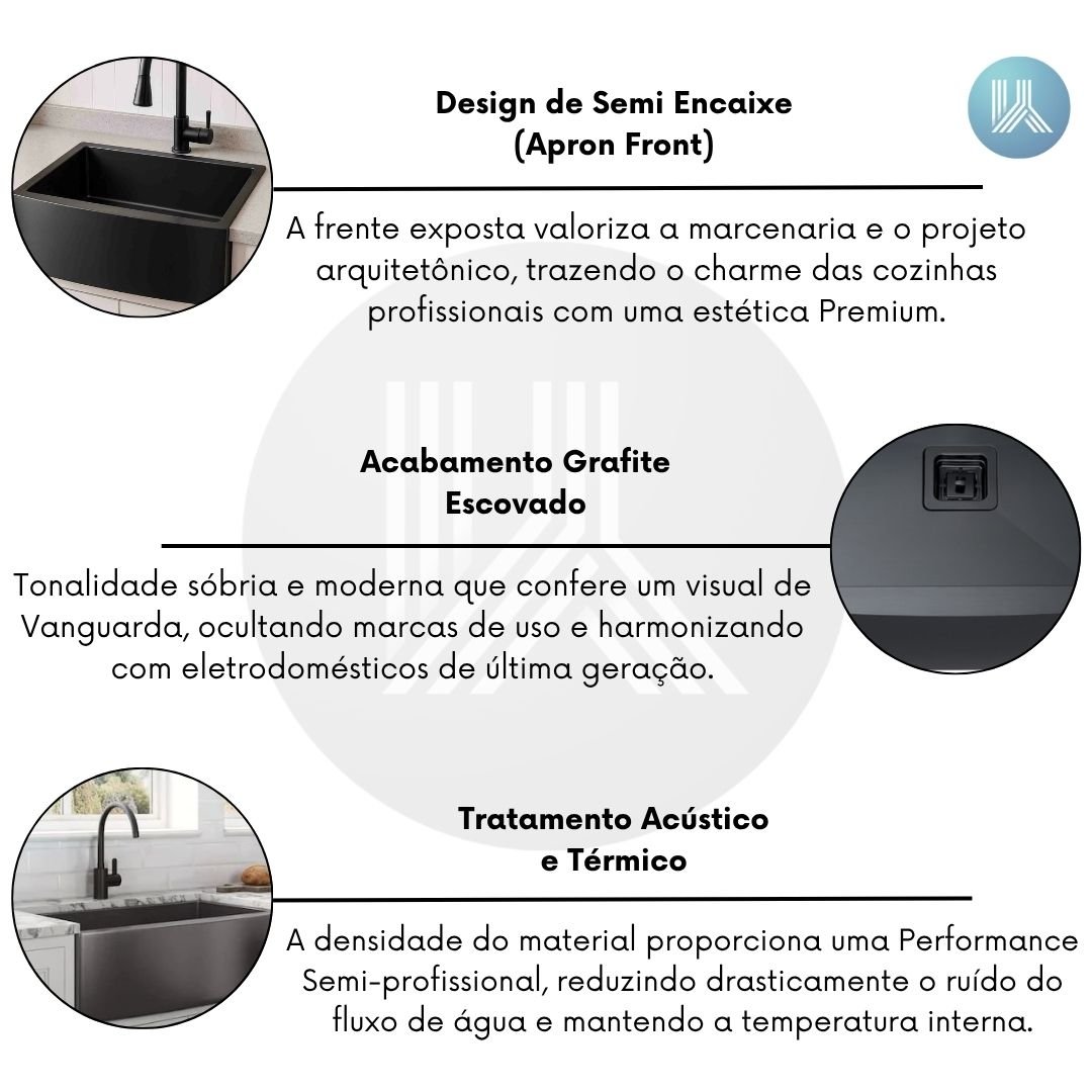 Em cozinhas contemporâneas de Luxo, a paleta de cores e texturas exige metais que fujam do óbvio. Cubas de inox convencionais e de baixa espessura muitas vezes não acompanham a imponência de pedras nobres, apresentando ruídos metálicos desagradáveis e uma estética comum que desvaloriza o Investimento no mobiliário. Além disso, ralos e cubas tradicionais podem sofrer com riscos visíveis e perda de brilho precoce. A Cuba de Semi Encaixe CUB2013 Grafite Escovado é a solução definitiva para este cenário. Com seu design de frente aparente (apron front) e tonalidade exclusiva, ela entrega uma Sofisticação visual profunda, aliando a robustez do aço industrial a uma presença de Elite na bancada.