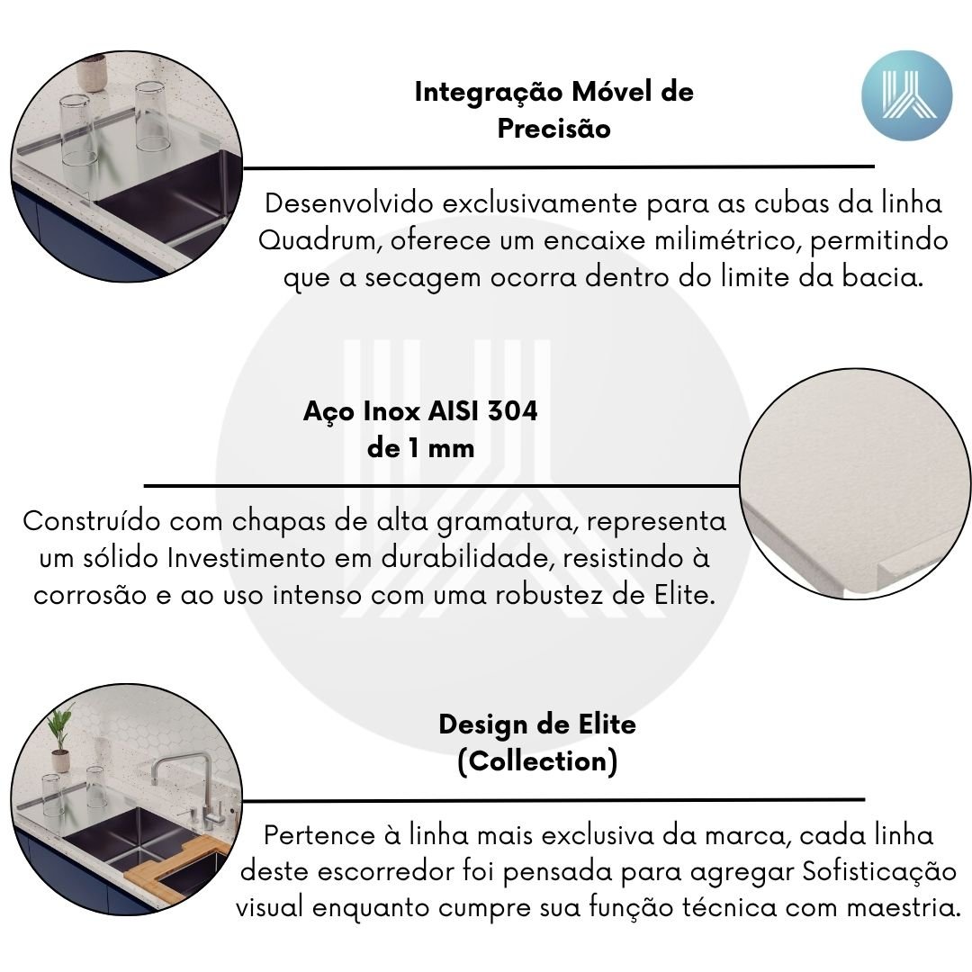 Desenvolvido exclusivamente para as cubas da linha Quadrum, este acessório oferece um encaixe milimétrico, permitindo que a secagem ocorra dentro do limite da bacia e mantendo a bancada impecável.