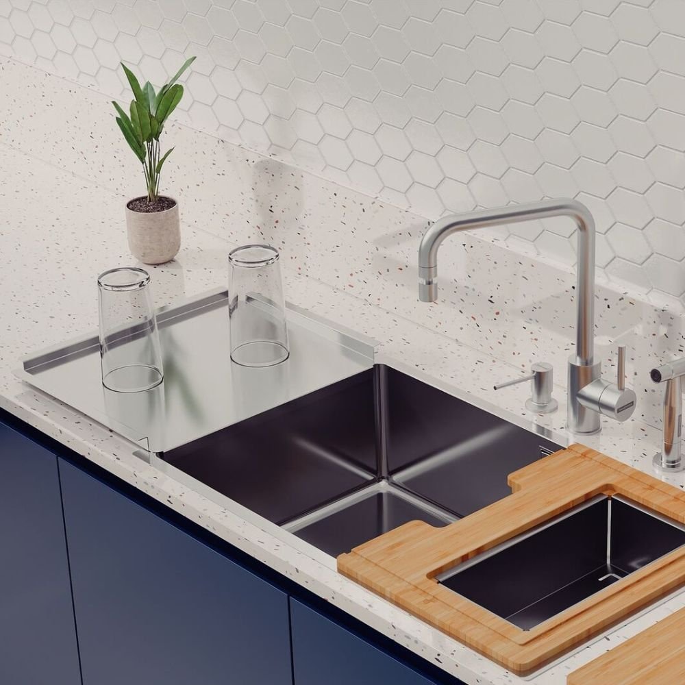 Em projetos de Luxo, a funcionalidade nunca deve sacrificar a estética minimalista da bancada. Escorredores convencionais sobre a pia ocupam espaço precioso e criam uma poluição visual que desvaloriza pedras nobres. O Escorredor de Louça Tramontina Design Collection para a linha Quadrum é a solução definitiva para este dilema. Ao integrar-se perfeitamente à geometria da cuba, ele libera a superfície de trabalho e mantém a louça organizada de forma discreta, entregando uma Performance Semi-profissional que preserva a fluidez e o prestígio da sua cozinha gourmet.