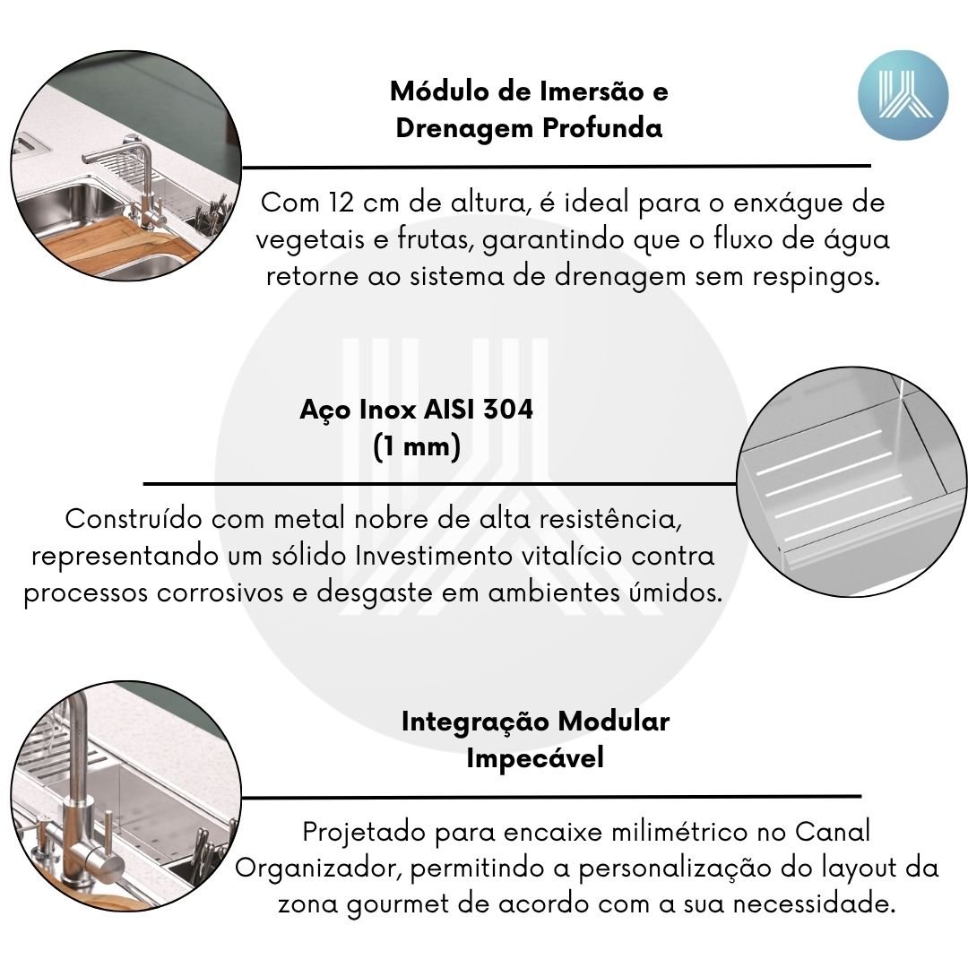 Em projetos de Luxo, a funcionalidade deve ser integrada para evitar o uso de escorredores externos e improvisados que poluem visualmente a bancada. A dificuldade de lavar e escorrer frutas, legumes ou até pequenos utensílios sem molhar a pedra gourmet é uma falha comum em cozinhas que não possuem acessórios de precisão. O Escorredor Profundo Tramontina para Canal Organizador é a solução definitiva para este dilema. Com 12 cm de profundidade, ele permite o manuseio de insumos diretamente na calha úmida, oferecendo uma Performance Semi-profissional que mantém a área de preparo seca, organizada e sofisticada.