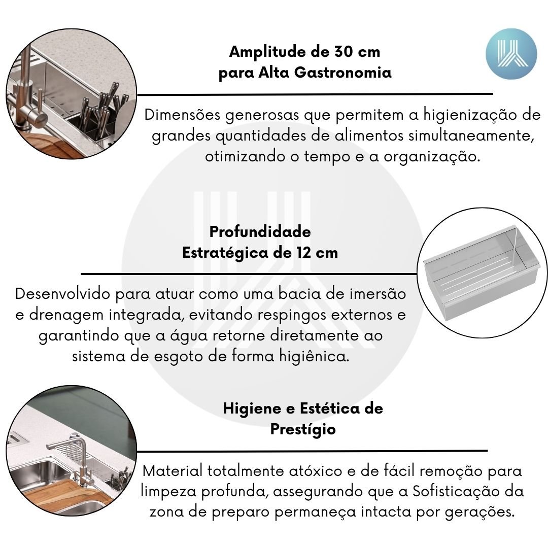 Dimensões generosas que permitem a higienização de grandes quantidades de alimentos simultaneamente, otimizando o tempo e a organização na zona gourmet.