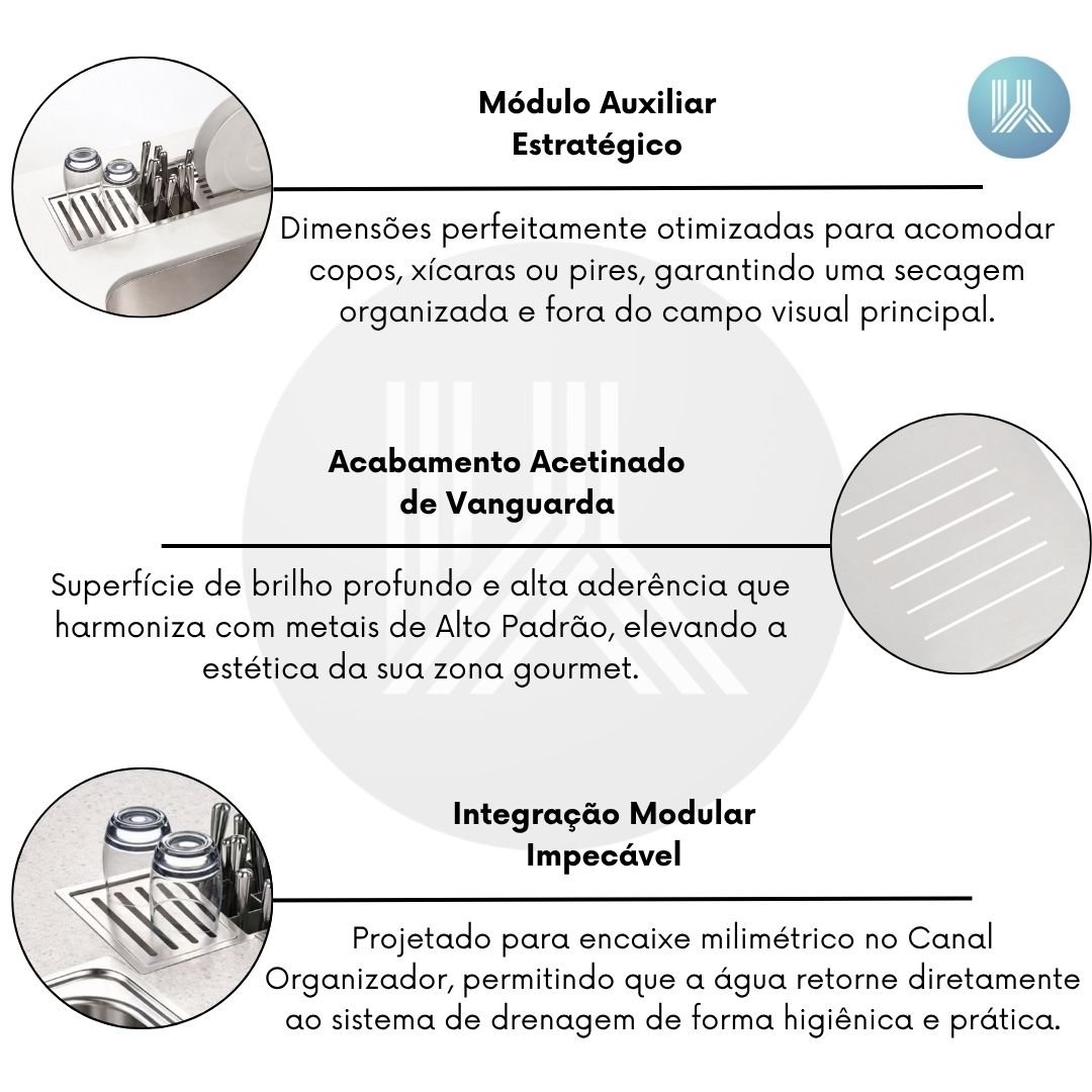 Projetado para encaixe milimétrico no Canal Organizador, permitindo que a água retorne diretamente ao sistema de drenagem de forma higiênica e prática.