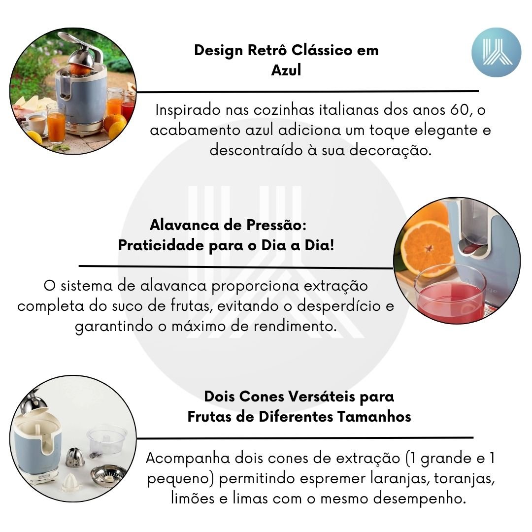 Com bico gotejador em aço inox e sistema antigotejamento, o Espremedor Vintage Azul evita respingos e desperdícios. As ventosas antiderrapantes proporcionam estabilidade durante o uso, e o enrolador de cabo embutido mantém o espaço organizado. Seu corpo metálico robusto assegura longa vida útil e resistência ao uso diário.