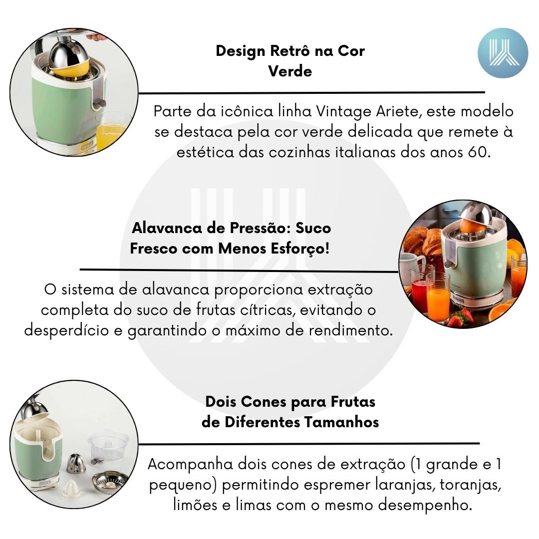 O Espremedor de Frutas Ariete 413 Vintage Verde une praticidade e estilo em um só produto. Com visual retrô inspirado no design italiano, traz o charme inconfundível da linha Vintage para a sua cozinha. Seu tom verde suave adiciona um toque decorativo e elegante, combinando com diversos estilos de ambiente, do moderno ao clássico. Com corpo metálico e alavanca de pressão, o modelo garante extração completa do suco com o mínimo de esforço, ideal para o dia a dia.