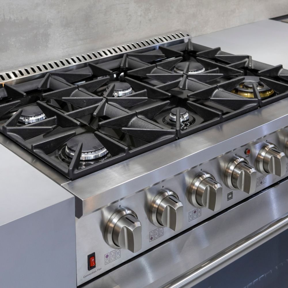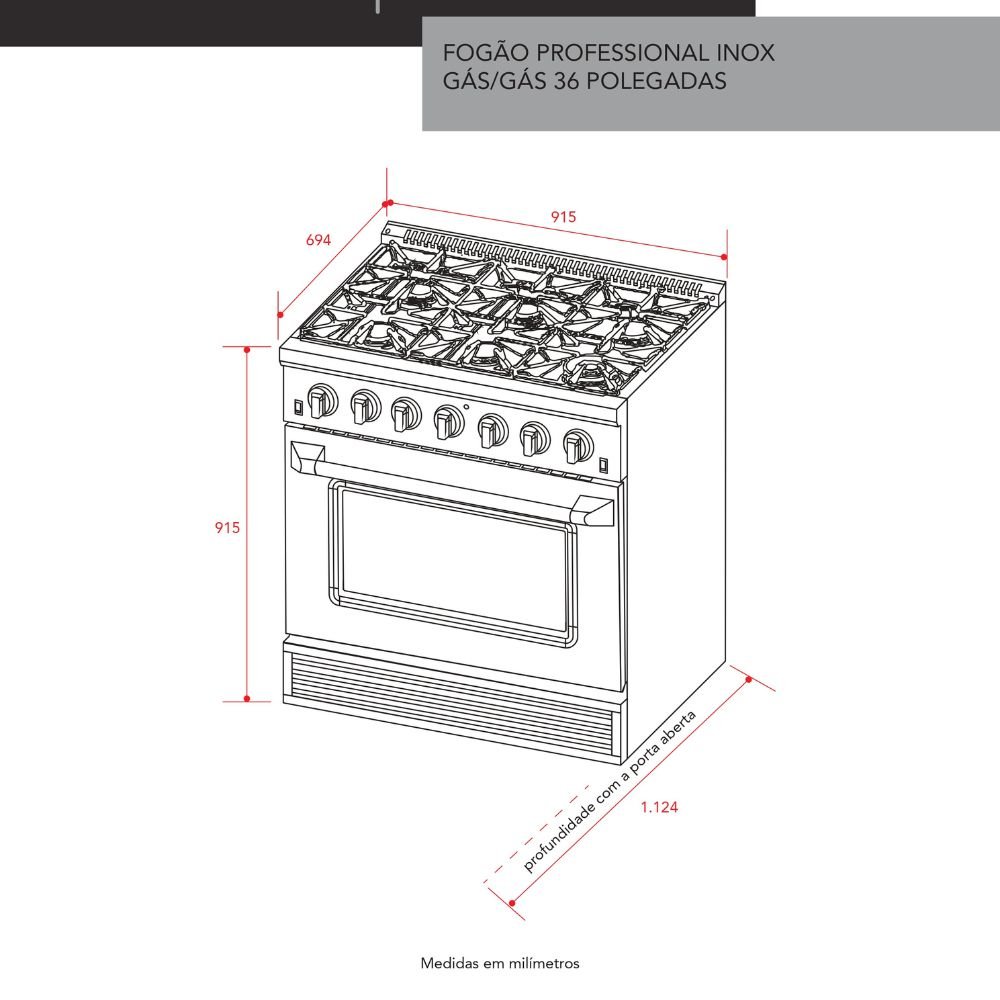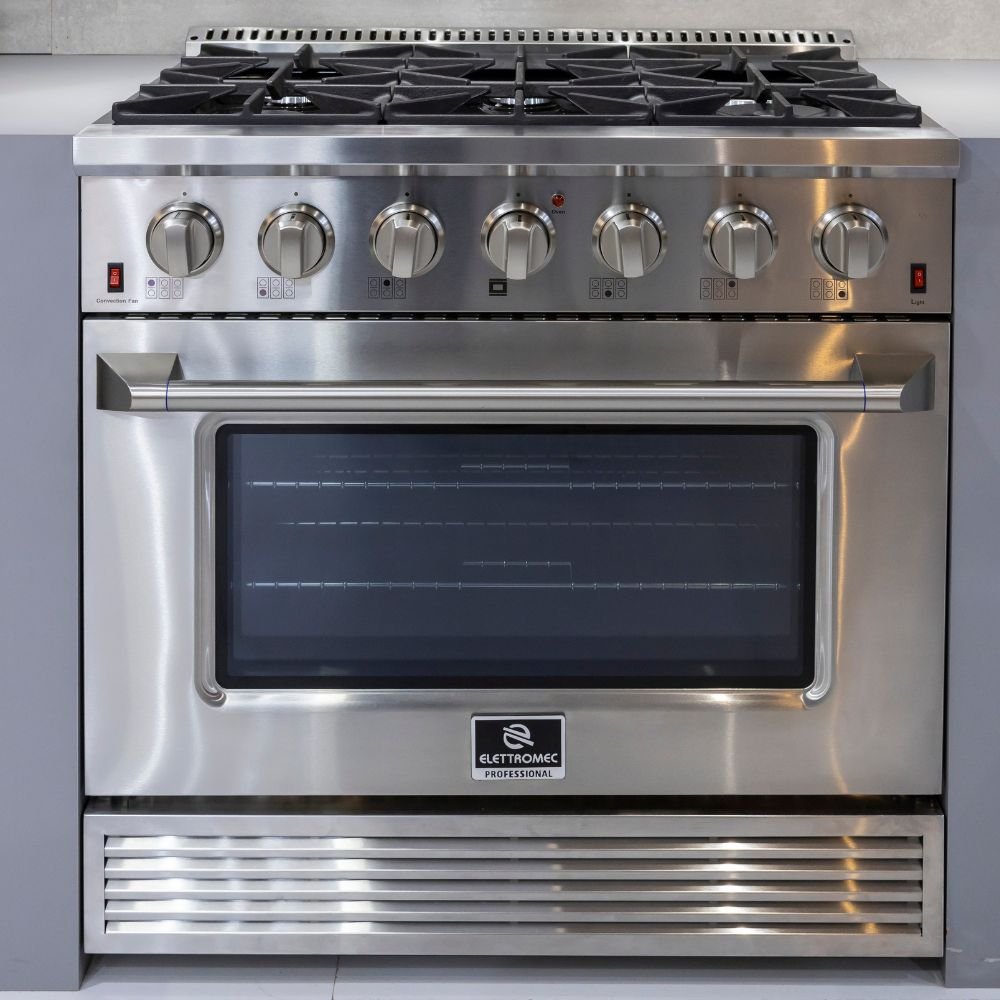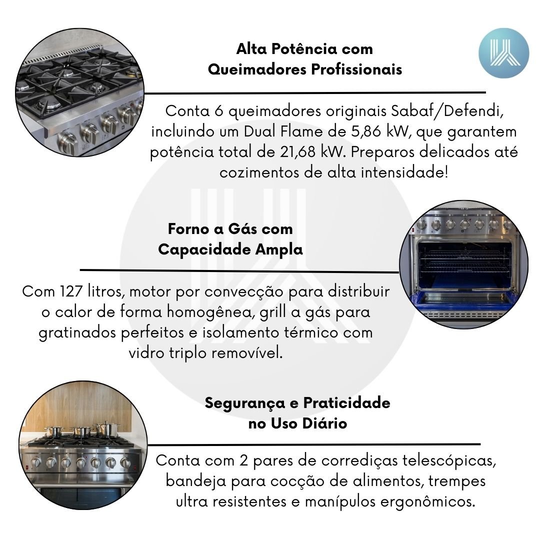 O Fogão Professional Inox Gás/Gás 36″ reúne robustez, alta performance e design inspirado nos modelos americanos, ideal para cozinhas modernas que buscam potência e estilo. Com acabamento em aço inoxidável, oferece durabilidade e sofisticação, além de um forno a gás com capacidade generosa, grill e tecnologia de convecção para resultados impecáveis em qualquer preparo.