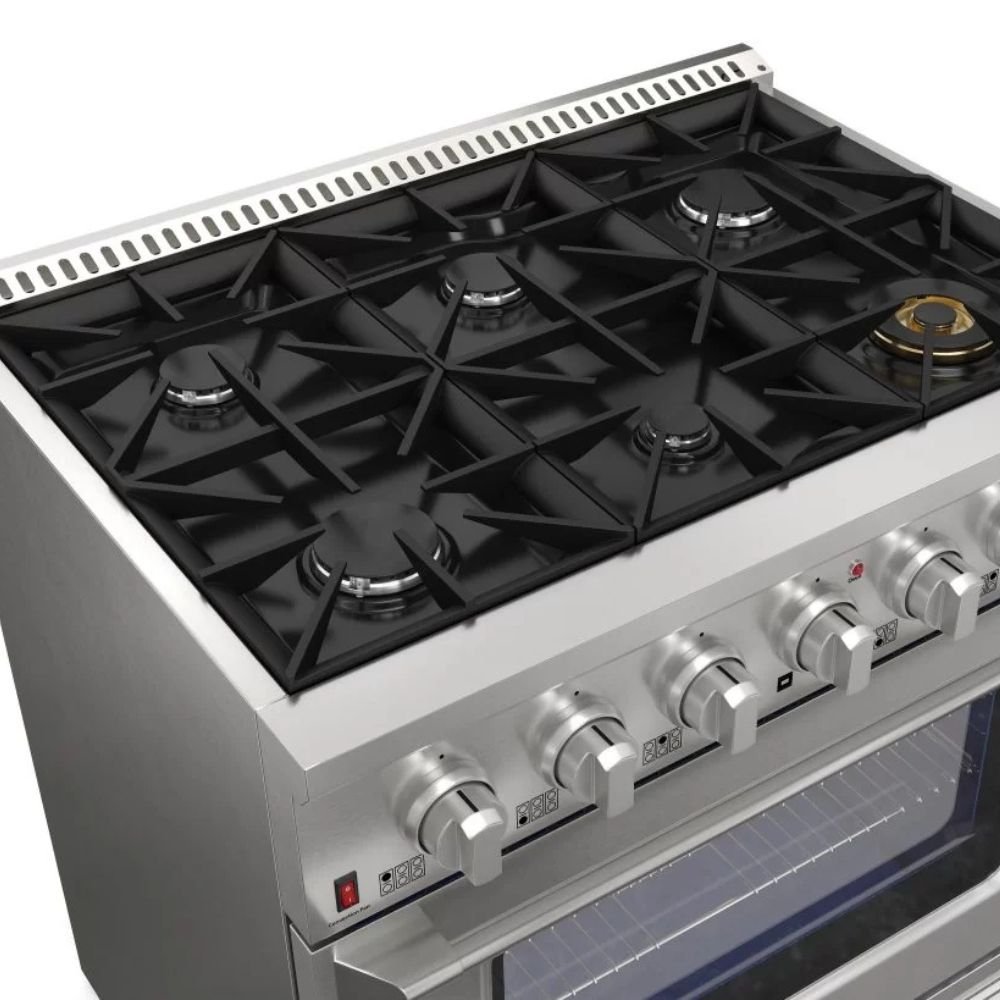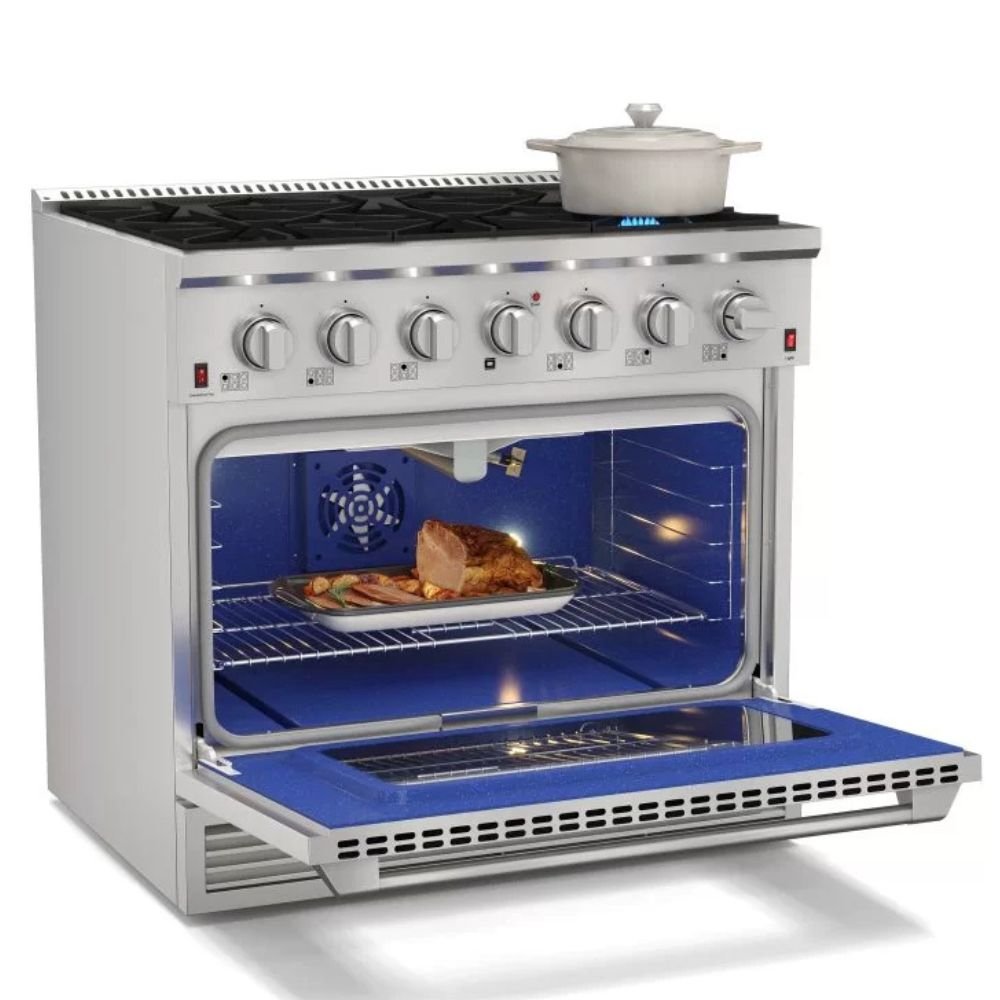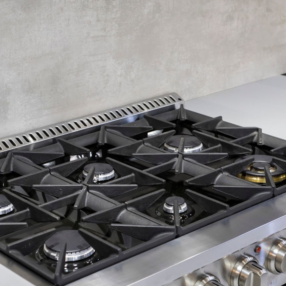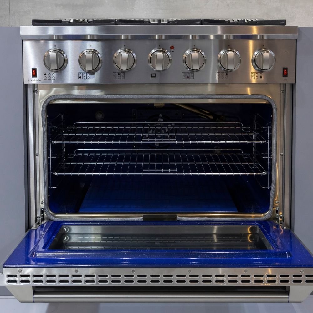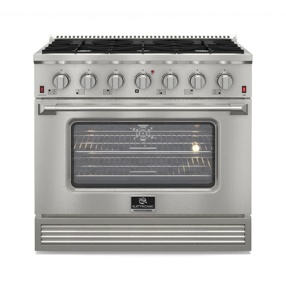 O Fogão Professional Inox Gás/Gás 36″ reúne robustez, alta performance e design inspirado nos modelos americanos, ideal para cozinhas modernas que buscam potência e estilo. Com acabamento em aço inoxidável, oferece durabilidade e sofisticação, além de um forno a gás com capacidade generosa, grill e tecnologia de convecção para resultados impecáveis em qualquer preparo.